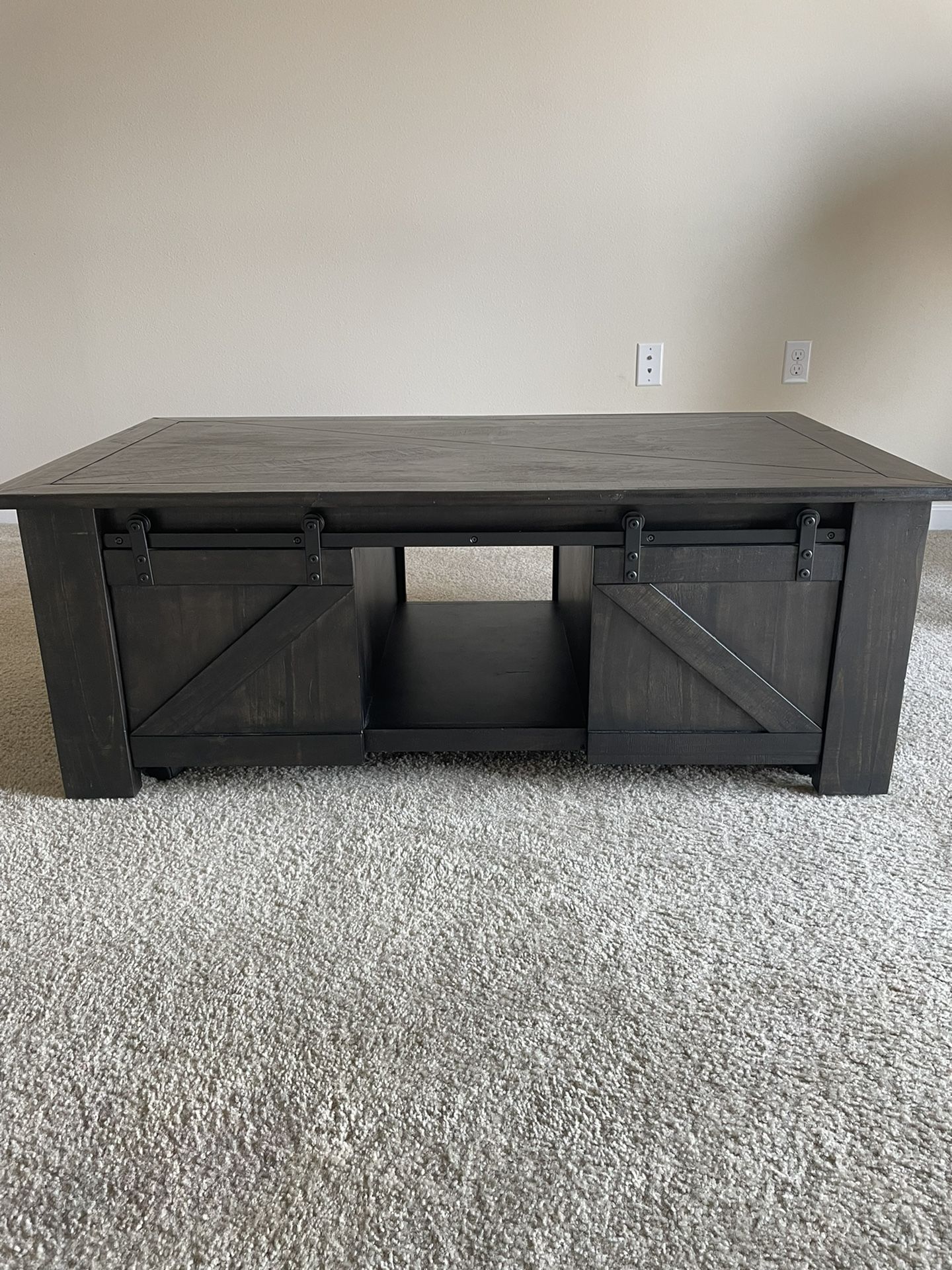 Great multi-purpose coffee table with lift top feature Storage containers with four sliding wood doors and metal rails Four bottom wheels for easy mobility Must be able to come pick up
