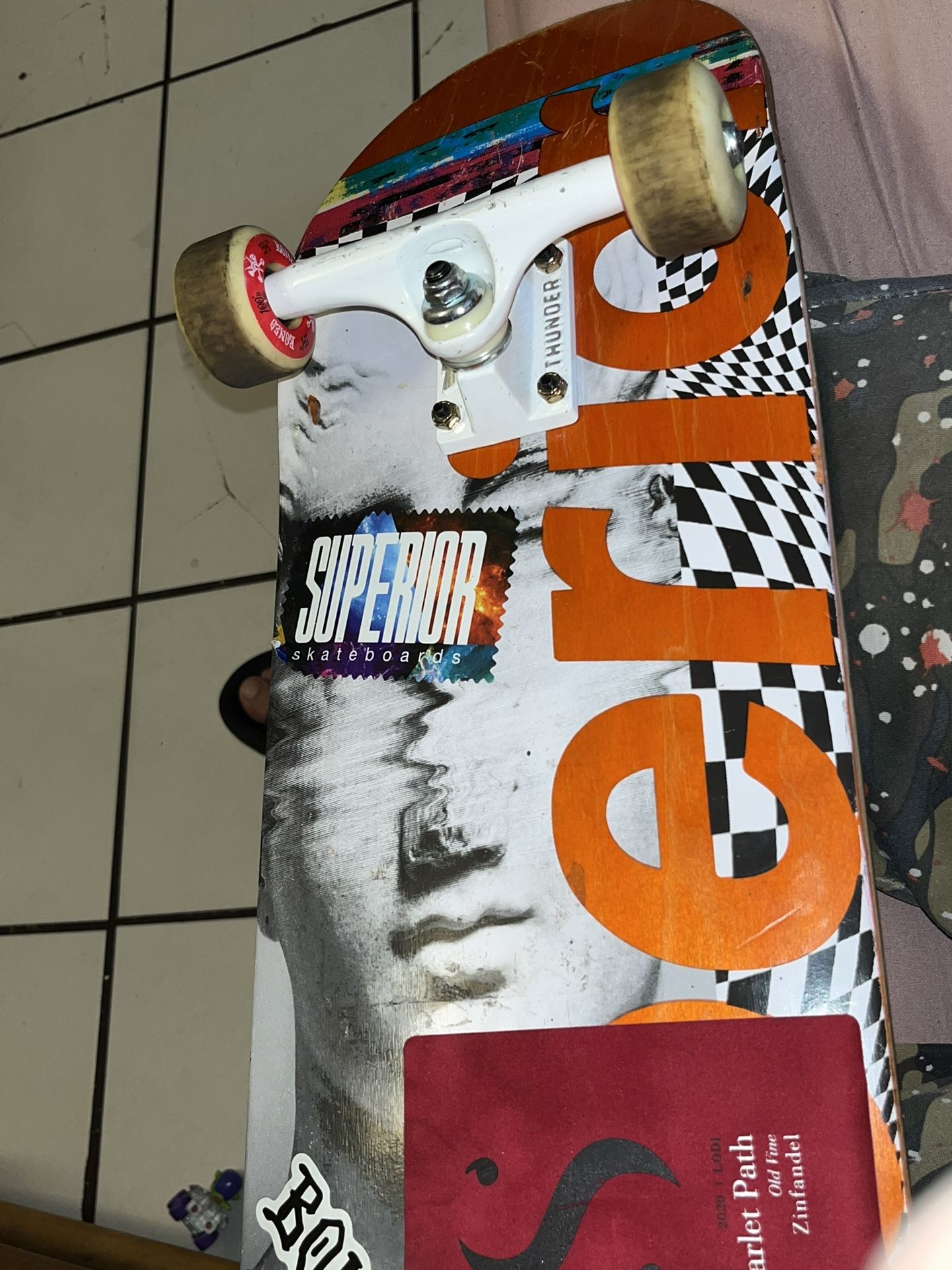 Redz barrings , thunder trucks, grizzly tape, bonez wheels ,diamond hardware this skateboard is great