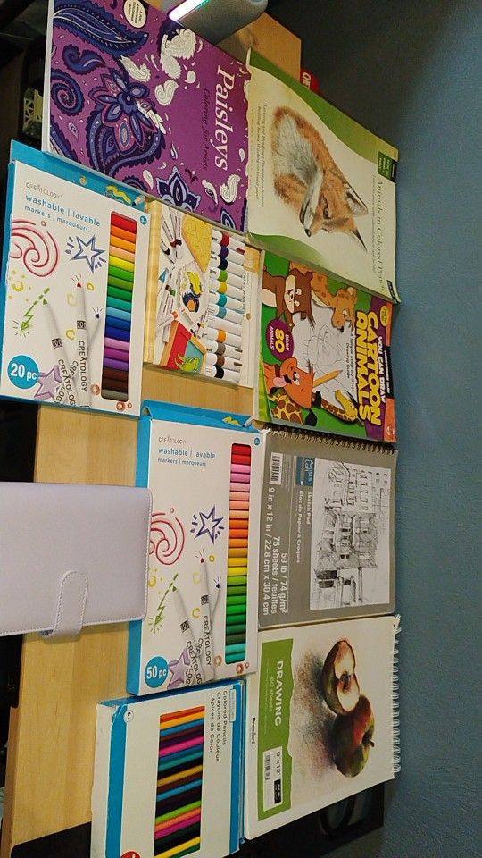 2 sketchbooks One color book Budget binder (sold) Two washable markers 20 Pc and 50pc Paint markers 12 count Colored pencils 72pc Two how to do draw books cartoon animals and realistic animals