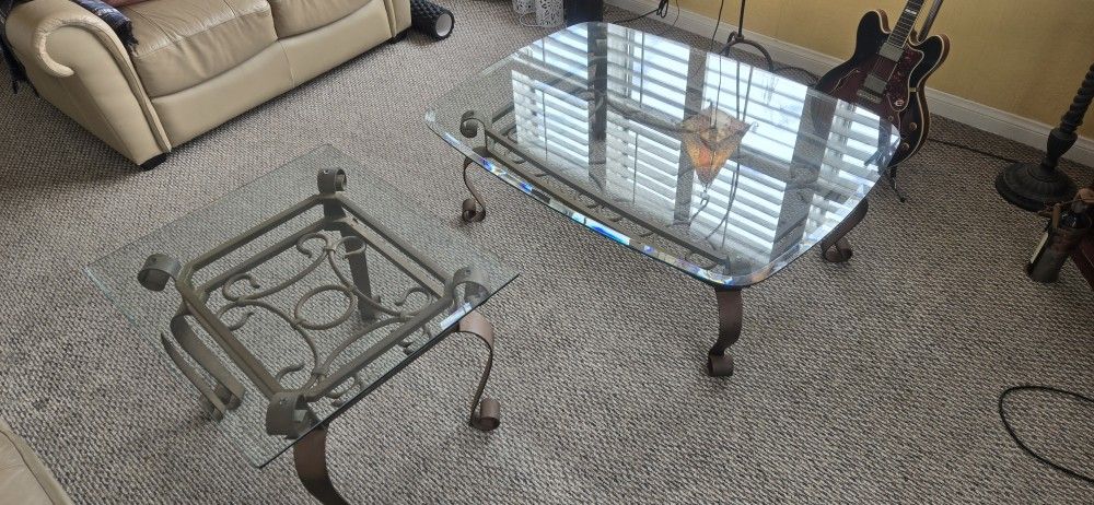Very nice set for any room! This same style of matching Coffee Table & End Table appeared numerous times in the apartment on the TV show "Friends". They've got great taste and you can have the same! The glass top of the coffee table is 4 ft long, 3 ft deep, and 17 inches off the ground. The wrought iron base makes a great centerpiece in any living room. PLUS Matching End Table: The glass top measures 28 inches x 24 inches and is 21.5 inches off the ground. This set always draws compliments from guests and is a great conversation piece. Moving sale! Great deal!