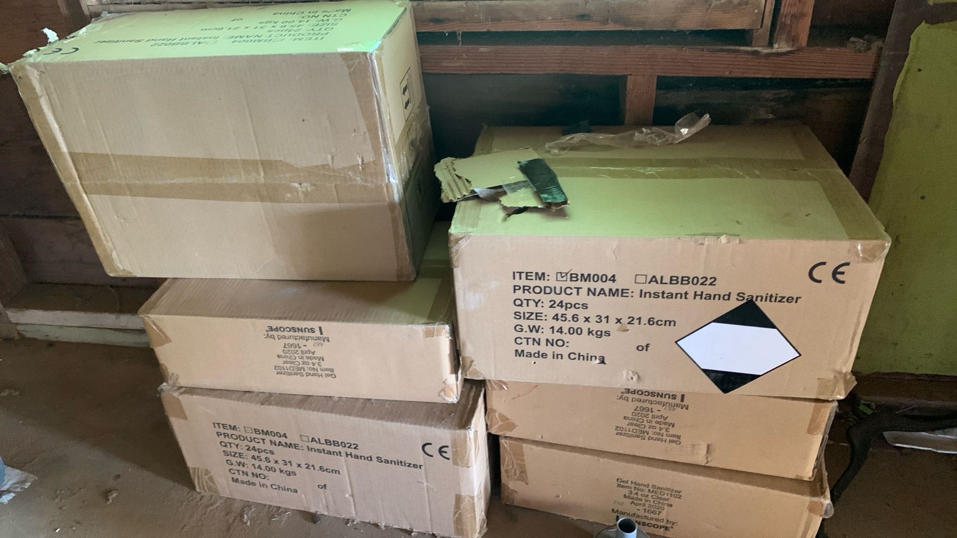 Boxes of hand sanitizer full of 1 ounce individual bottles and 3.5 ounce liter bottles