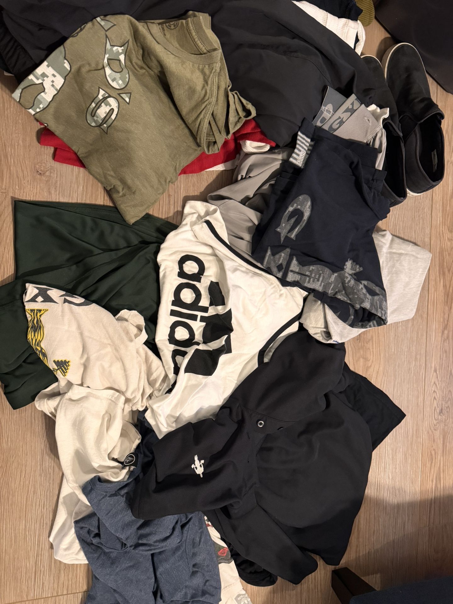 Used but great condition. Adidas, Golds gym, Hurley, billabong. All for $25 Multiple shorts 34-36 in waist 4-5 shirts Tank tops, t shirts all L or XL. Multiple thermal long sleeves L or XL