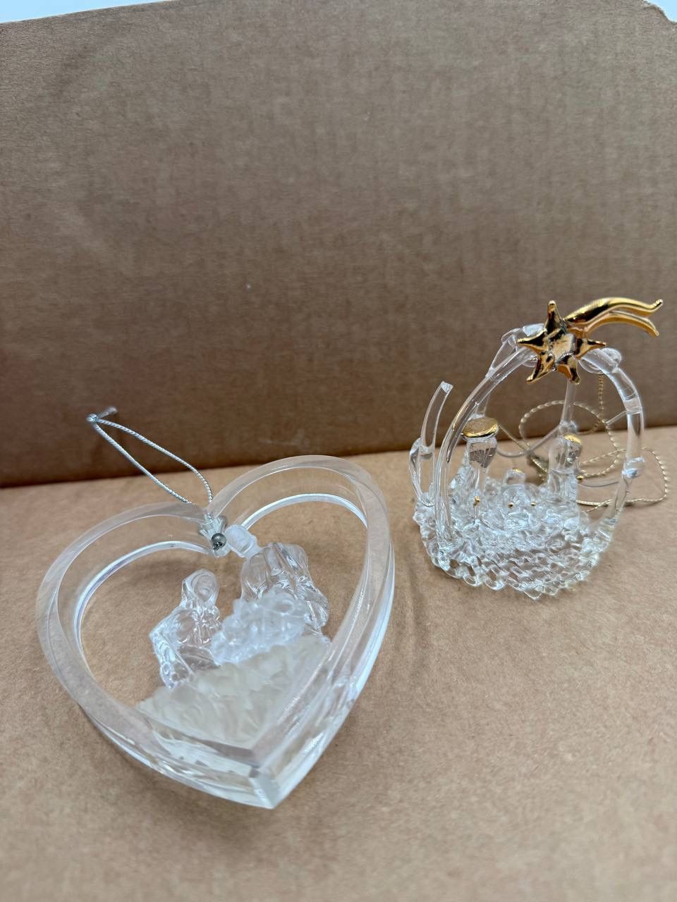 Item 1: Beautiful clear glass nativity ornament featuring Mary, Joseph, and Baby Jesus under an elegant arch with a gold shooting star on top. Delicate transparent glass design with gold-tone accents makes this ornament shine beautifully on a Christmas tree or as a faith-based holiday display. Details: • ✝️ Nativity scene (Mary, Joseph & Baby Jesus) • ⭐ Gold-tone shooting star accent • 💎 Clear glass construction • 🎄 Hanging Christmas ornament • 🎁 Perfect religious holiday gift Item 2: Elegant heart-shaped clear glass nativity ornament featuring a serene depiction of Mary and Joseph with Baby Jesus. A symbolic and meaningful Christmas decoration representing love, faith, and the true meaning of Christmas. Details: • ❤️ Heart-shaped clear glass frame • ✝️ Nativity scene inside • 🎄 Hanging ornament with silver cord • ✨ Minimalist, elegant religious decor