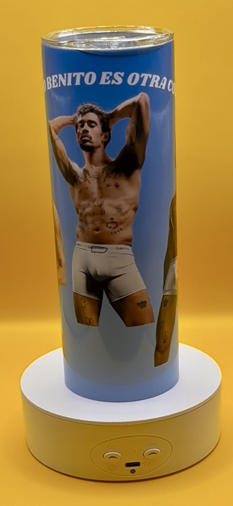 Bad bunny tumbler in blue with the frase “ACHO BENITO ES OTRA COSA” I personally made the tumbler but due to a lil error as you will be able to see in the first picture due to where it says Calvin Klein on his brief in the front there is a puerto map which is visible. I usually sell the tumblers for $35 but due to error I am selling it for $25. As is.