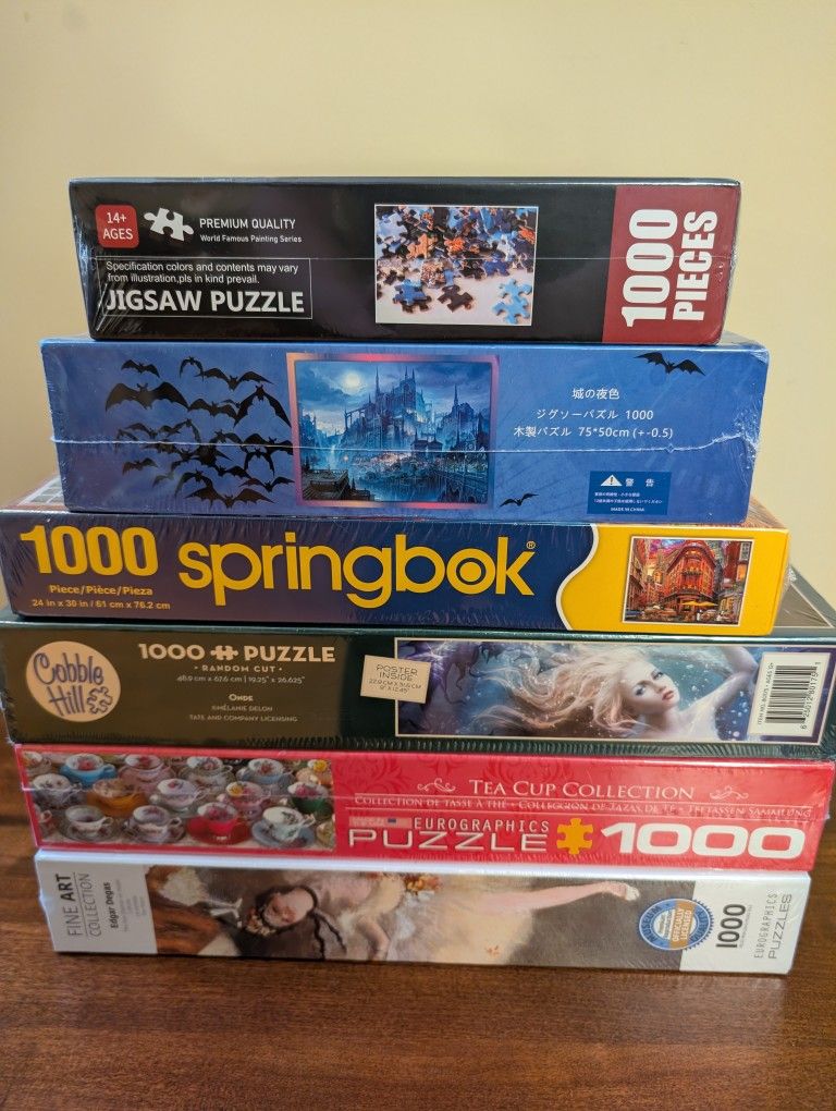 New 1000 Piece Jigsaw Puzzles. $10 each or all 6 for $50. No other offers. Smoke free home. Pick up in Garner near 801 Poole Dr (for reference). Cash only.