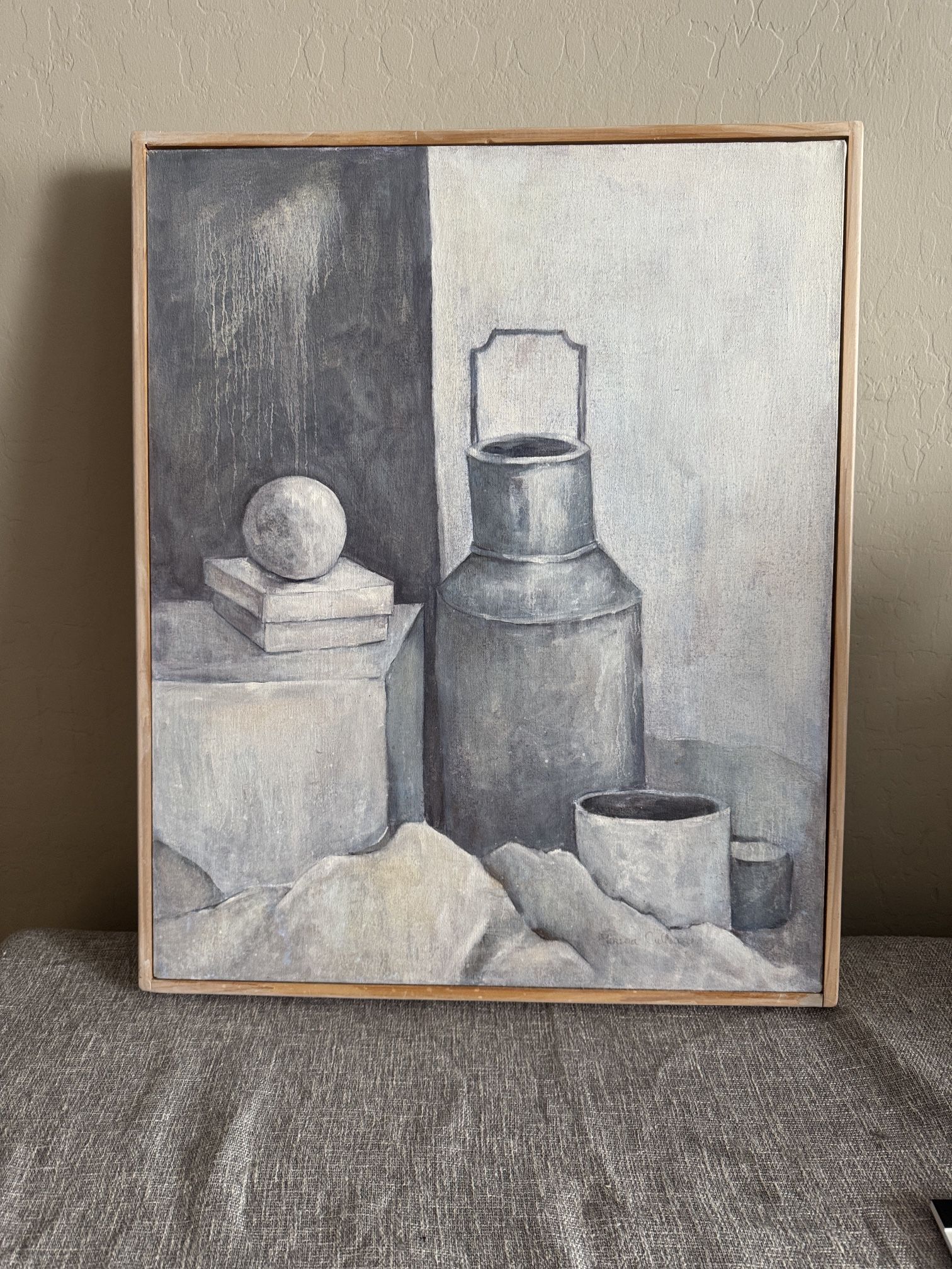 25x20 canvas with wooden frame: still life painting using shades of gray to create a monochromatic image,
