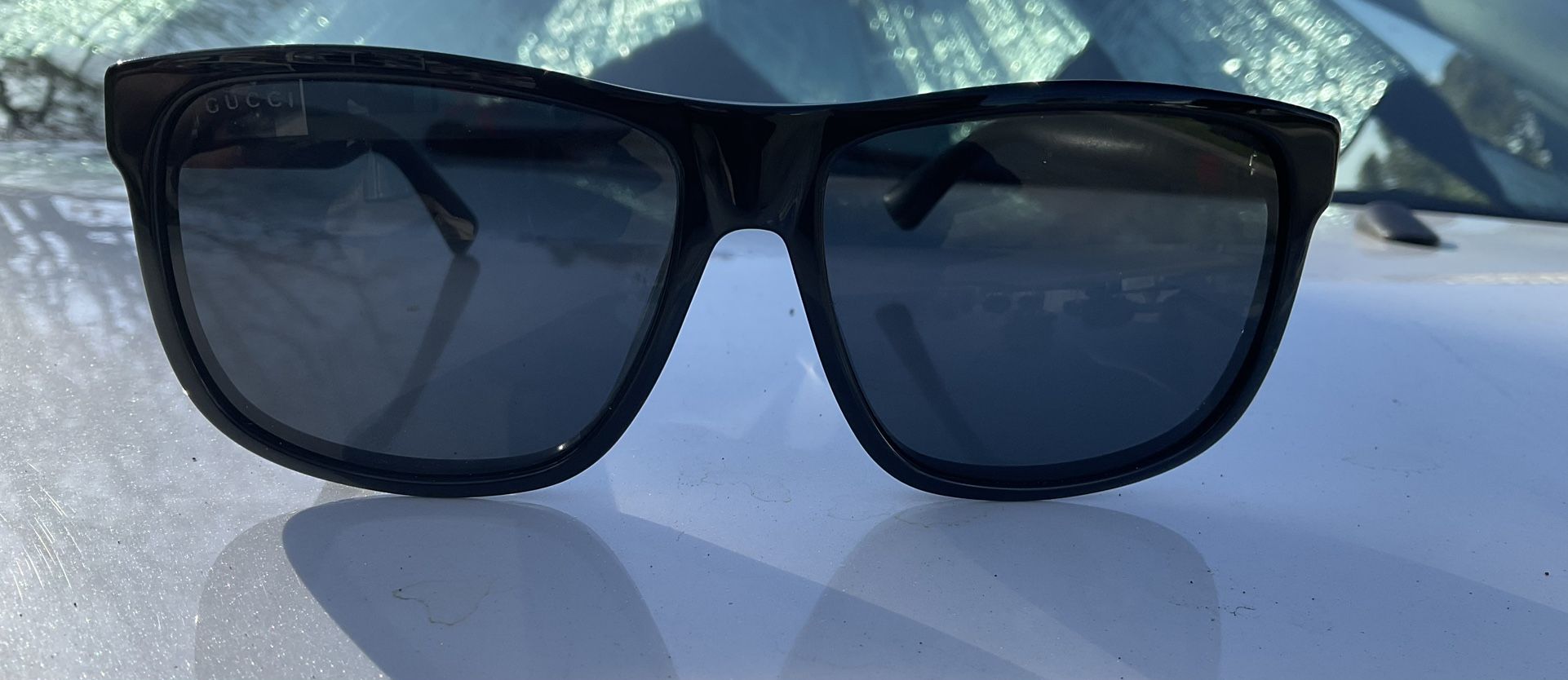 These are Gucci Men's GG0010S sunglasses in black, featuring a bold square acetate frame and rubber temples. They are in fantastic shape.