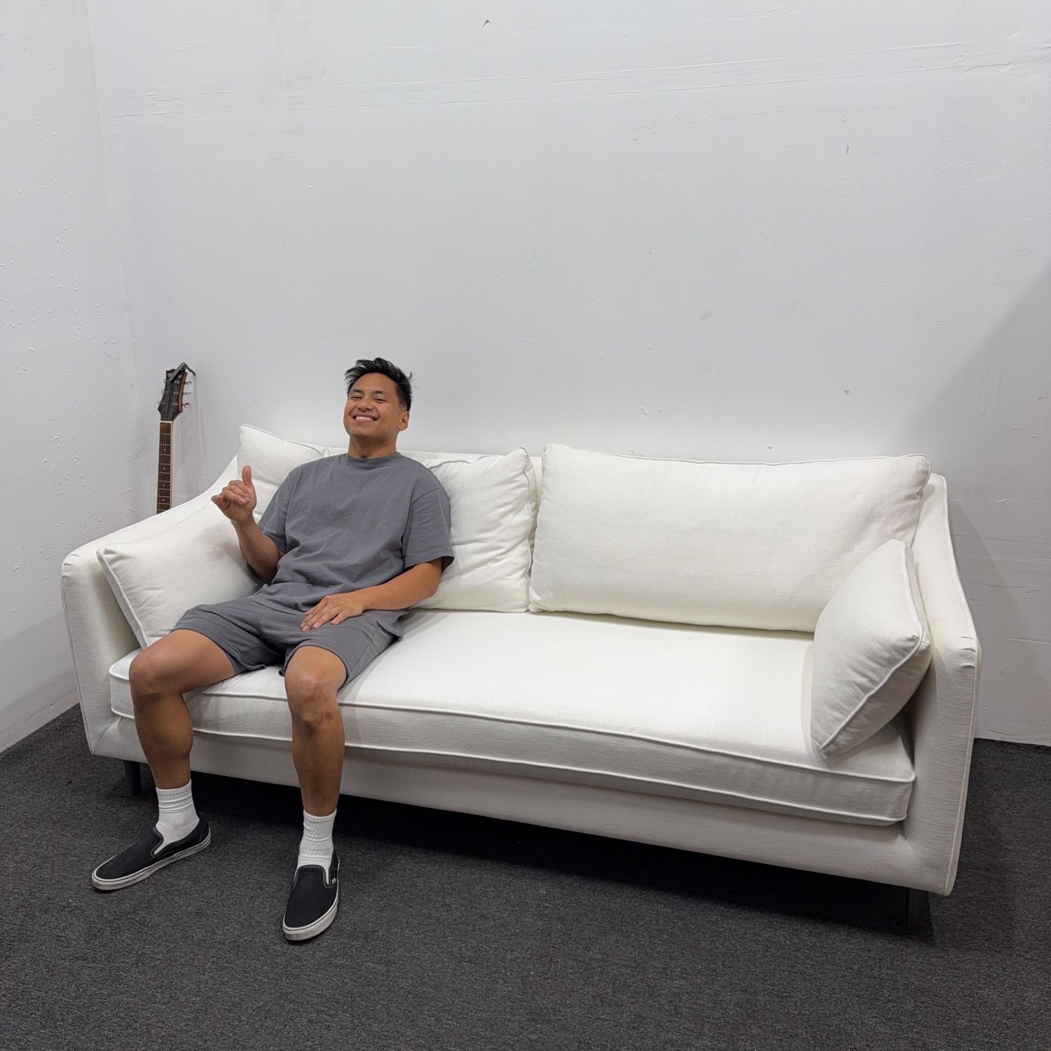 Brand new white sofa, Retails 2.5k. Yours for a fraction. Has a simple, modern design with clean lines and comfortable cushions. Washable Covers. Performance Classic Weave - Porcelain White. 83” x 37” Overall. Upgraded to Tapered Turned Wood Legs (See last photos)