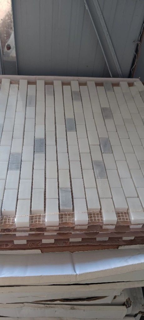 5/8 × 1 1/4 Dolemite rain mosaic tile sheets. $28 plus tax per square foot in stores. $3.75 sqft . There's a little over 90 square foot available. 19 boxes 5 per box. $3.75 a square foot or $250.00 for all.