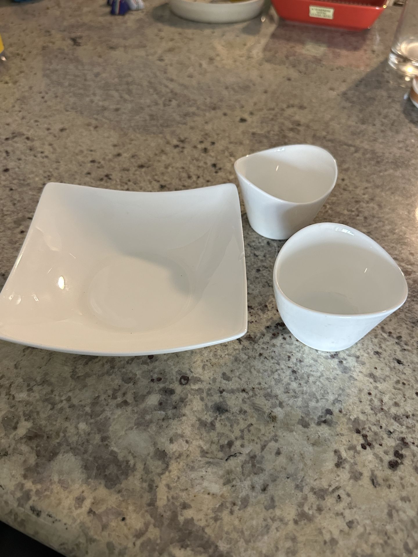 Includes: • 1 square white dish by Fenton & Fenton (fine bone china) • 2 small white bowls by IKEA Sizes: • Larger dish: approx. 7” diameter • Small bowls: approx. 3” diameter each Condition: Large dish has one small chip on the edge (shown in photos). Small bowls are in very good condition with no cracks or chips. Glossy white minimalist design — perfect for sauces, snacks, jewelry catchall, dips, or modern table settings. Dishwasher & microwave safe (per bottom markings). Marina Del Rey pickup