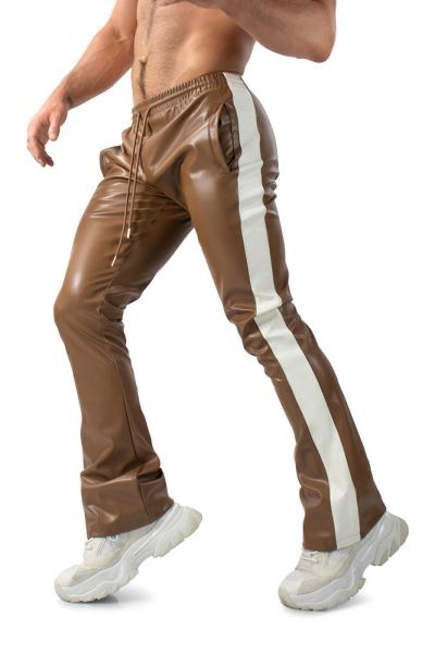 Size: M Waist Size: 32 - 34 Faux Leather Flare Joggers with Side Stripe. These mens leather flare joggers feature a stacked, flared fit in stretchy brown synthetic leather with white side stripes. Styled after retro track pants, these sporty bell bottom pants come with an elasticized drawstring waistband, four-pocket design, and soft-touch interior. Our flared leather joggers for men are just the thing for leisurely hangouts and laidback weekends. Runs long for stacked effect.