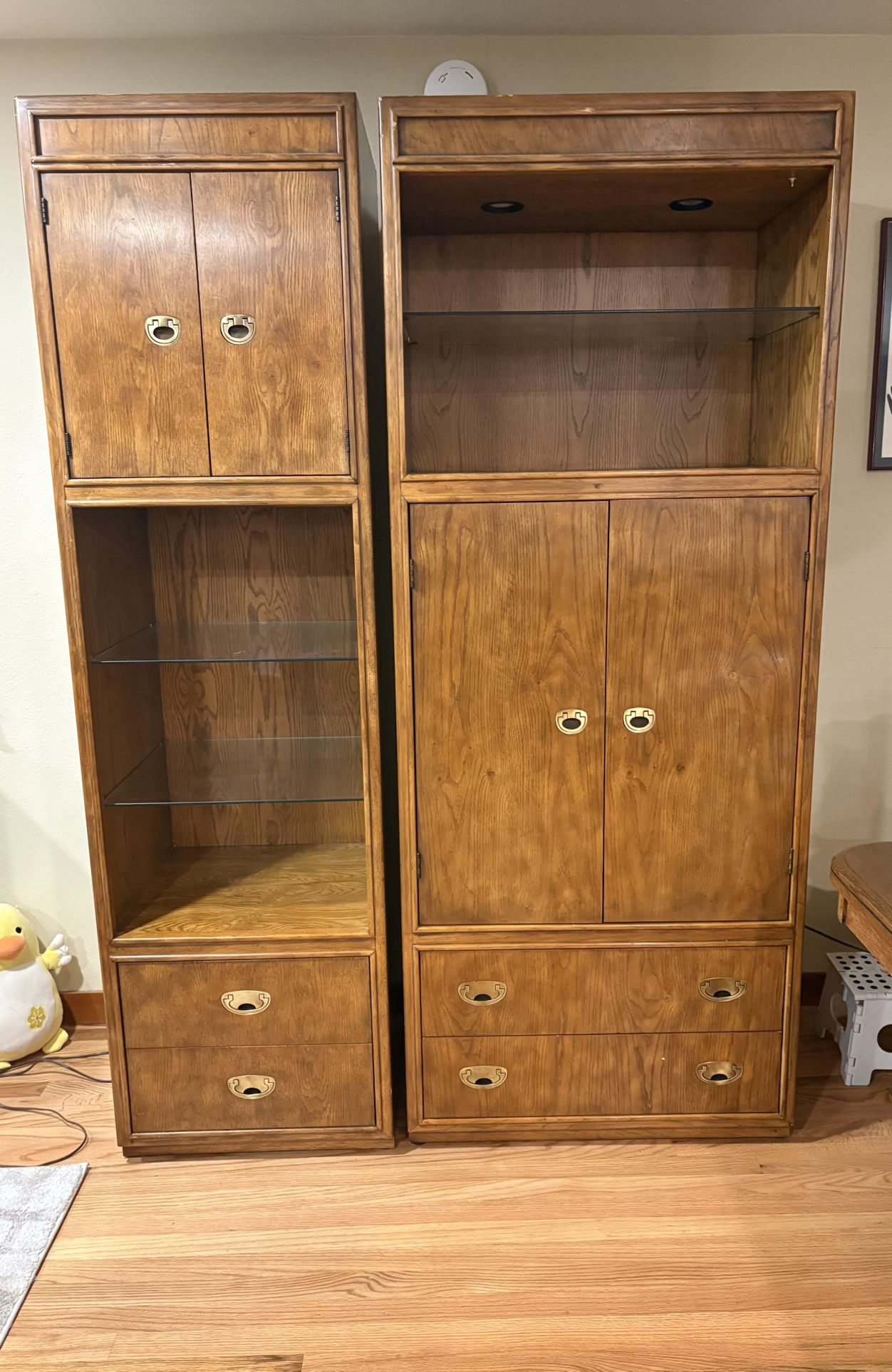 Two tall solid wood cabinets that can be bought together or separate. Both have lighting fixtures, multi-shelves and drawers for display/storage. Larger unit has two shelves on top with lighting, closed “media” cabinet that includes a shelf/box with a roll out shelf that could hold something ~27”wide x 22.5” tall, then two drawers at the bottom with one that has section dividers that can be removed. $80 on its own. Smaller unit has closed cabinet with one shelf, then three open shelves with lighting and some small damage on the back wall, followed by two drawers at the bottom. $50 in its own. $100 as a pair Approx measurements: Large-32” wide x 80” tall x 20” deep. Small -22.5” wide x 80” tall x 20” deep. These are heavy, quality-made items.