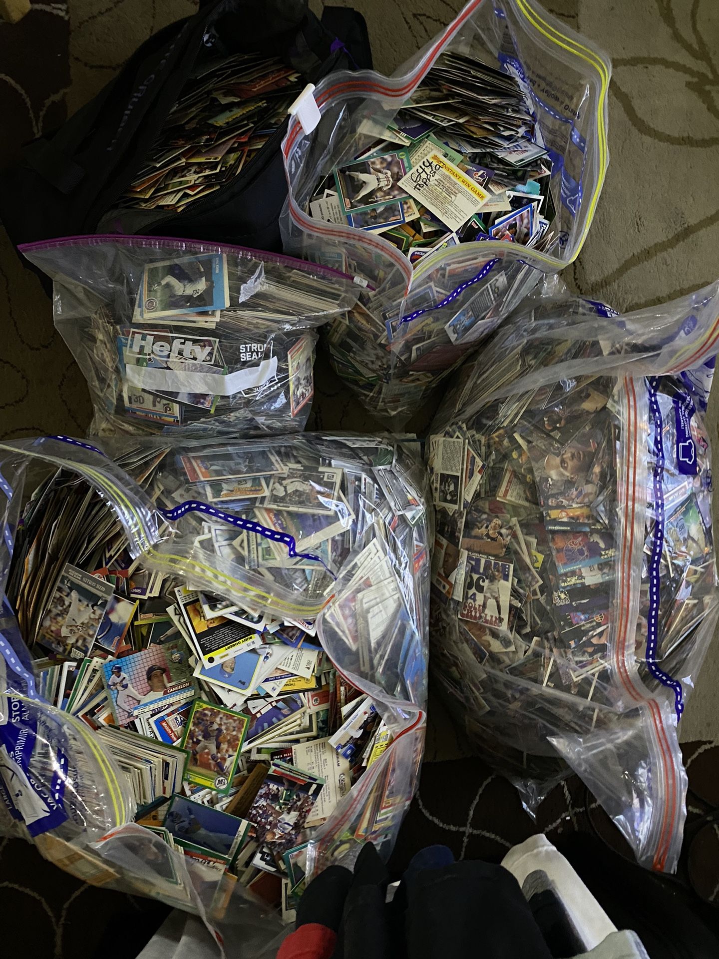 3 or 4000 cards maybe more there’s a bunch of sets in there for sale 120 bucks or best offer. Need them gone by this weekend or they’ll be donated thank you.