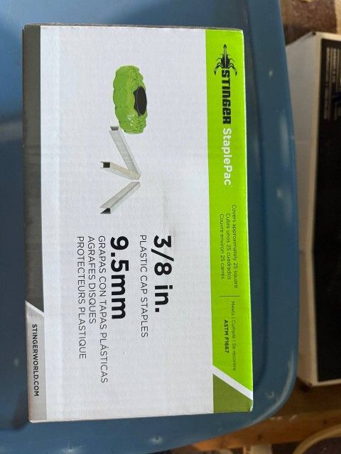 Brand new box of Stinger StaplePac plastic cap staples. • Size: 3/8 inch (9.5mm) • Meets ASTM F1667 standard • Covers approx. 25 sq. ft. Perfect for roofing, house wrap, and underlayment applications.