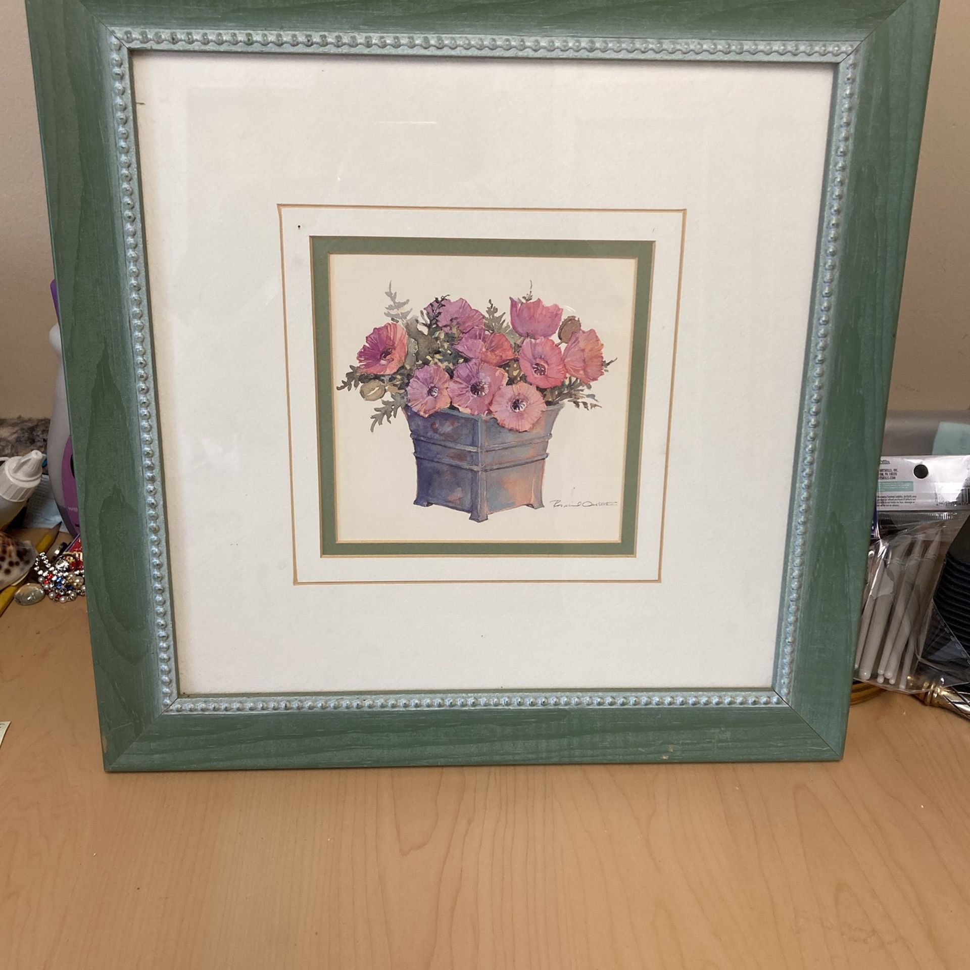 Still life water color painting of pink flowers framed and matted. Signed by artist Rosalind Oesterle. Frame is a place green shade. Very pretty for a bath or bedroom.