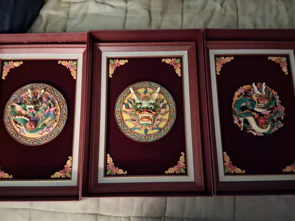 3 dragon pictures. It's a ceramic dragon on red velvet backing. Each one comes in there own red box. Very beautiful... I'm asking $25 each.