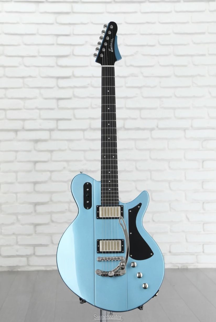 NEW GORGEOUS EASTMAN JULIET-LA-CELESTINE BLUE The latest and greatest from the winning streak of Otto D'Ambrosio, the Juliet LA takes Eastman's latest original solid-body design and makes it positively drip with west coast cool. The Celestine Blue finish is a sight to behold, and the Phat Cat P90 pickups offer plenty of punch and body. Eastman continues to impress! • Body: Okoume • Nut width: 1.68" • Pickups: Seymour Duncan Radiator Phat Cat • Weight: 6.82 Ibs • Case: Gig Bag