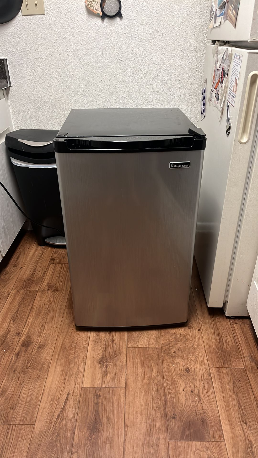 WORKS!! OBO 4.4 Cu. Ft. Capacity Stainless Steel Look Door / Black Cabinet Full Width Freezer Compartment Glass Shelves Adjustable Temperature Thermostat Control