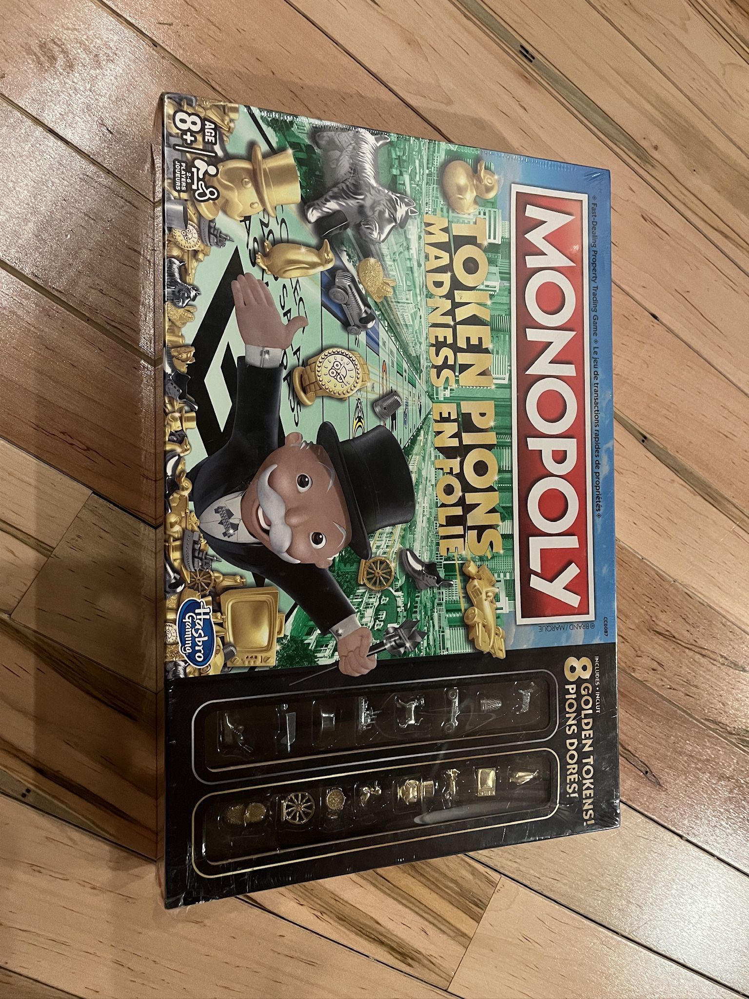 It's the fast-dealing property trading game with 16 game tokens in one pack! Make a move, make a deal, make a fortune with the Monopoly Token Madness game. Players can move around the board using one of the 8 current tokens, or they can choose one of the 8 golden tokens that are featured in this edition of the game. The golden tokens include a penguin, a television, a racecar, the Mr. Monopoly emoji, a rubber duck, a watch, a wheel, and a bunny slipper.