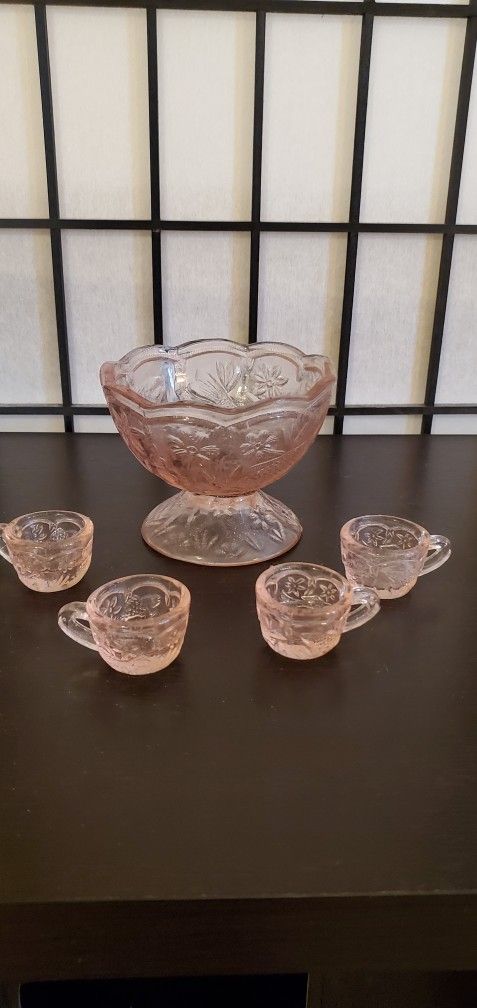 Art glass child mini punch bowl 5-Piece set Fish And Flowers Rose Pink doll collect