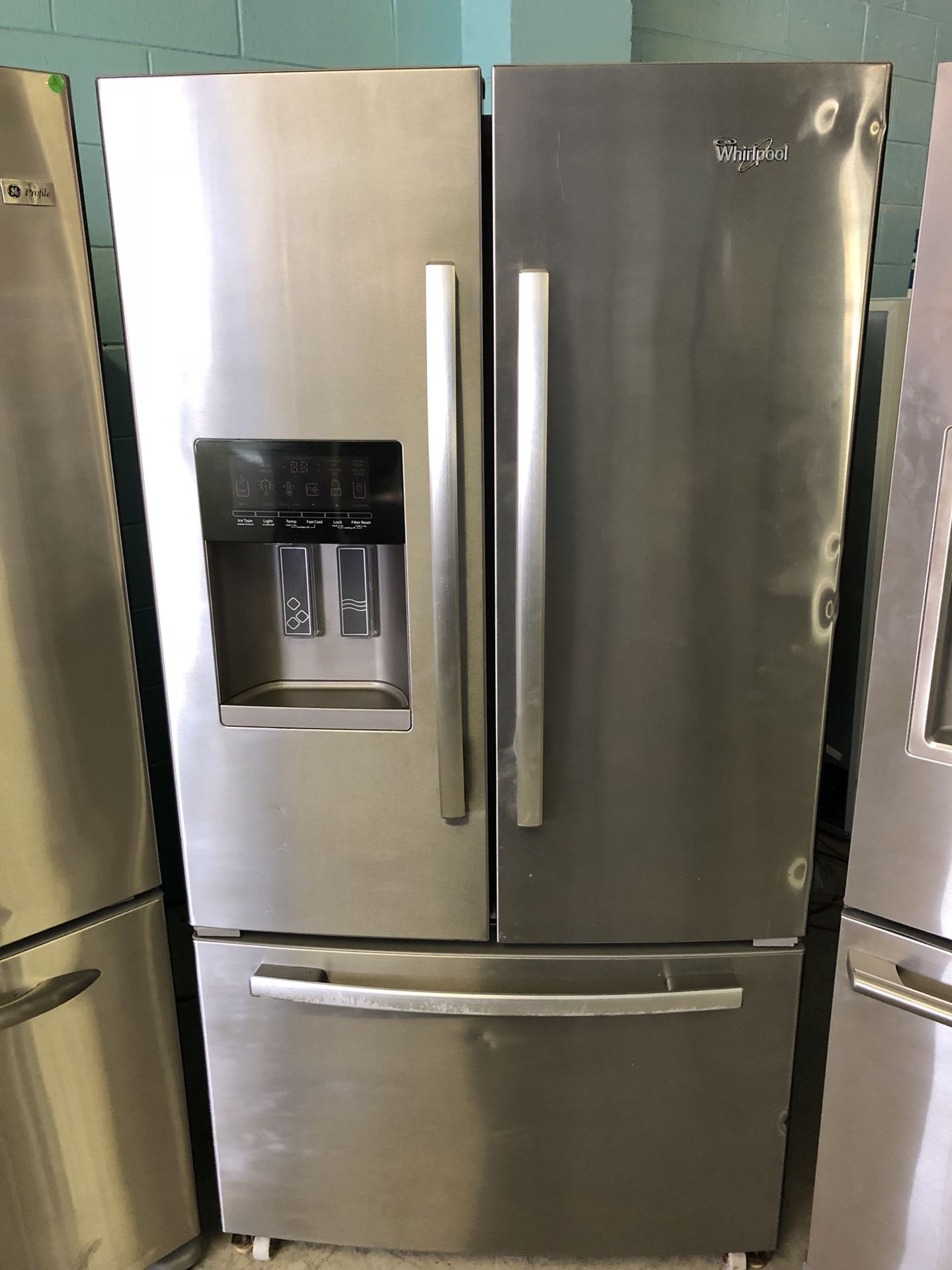 Whirlpool ice n water in the door stainless french door refrigerator. Food section has adjustable split spill proof glass shelves 2 humidity controlled crispers full width deli draw and gallon size door bins. Freezer is a pull out draw with 2 baskets. Comes with 120 day warranty. Financing and delivery available.
