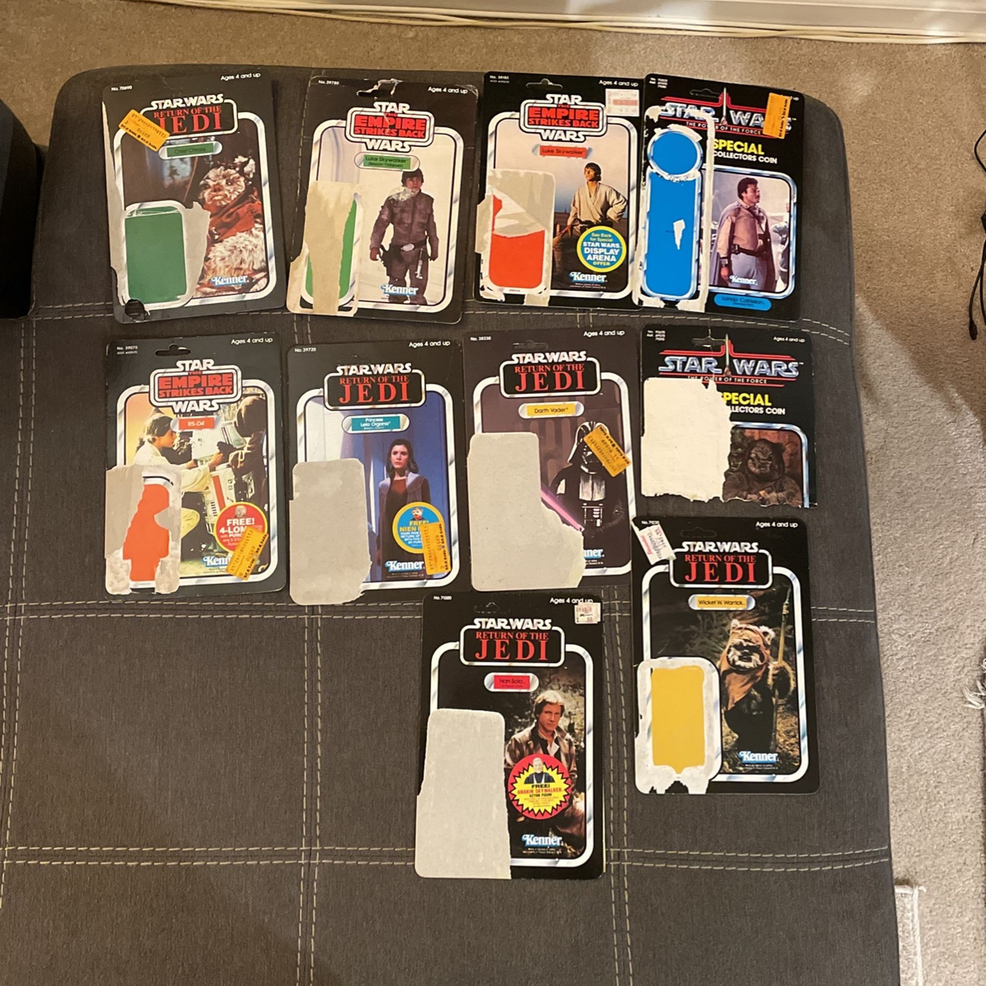 Authentic Star Wars Cardbacks Figures Not included Prices are for cards individually Safe shipping with card board backing Chief Chirpa—$27 R5-D4–$27 Luke Skywalker Bespin Fatigues—$26 Luke Skywalker (empire strikes back)—$80 Lando Calrissian —$40 Wicket W. Warwick —$40 Han Solo (in trench coat)—$35 Princess Leia Organa (Bespin gown)—$70 Darth Vader—$125 Group purchases get priority and discounts- within reason. Feel free to ask. More photos can be posted.
