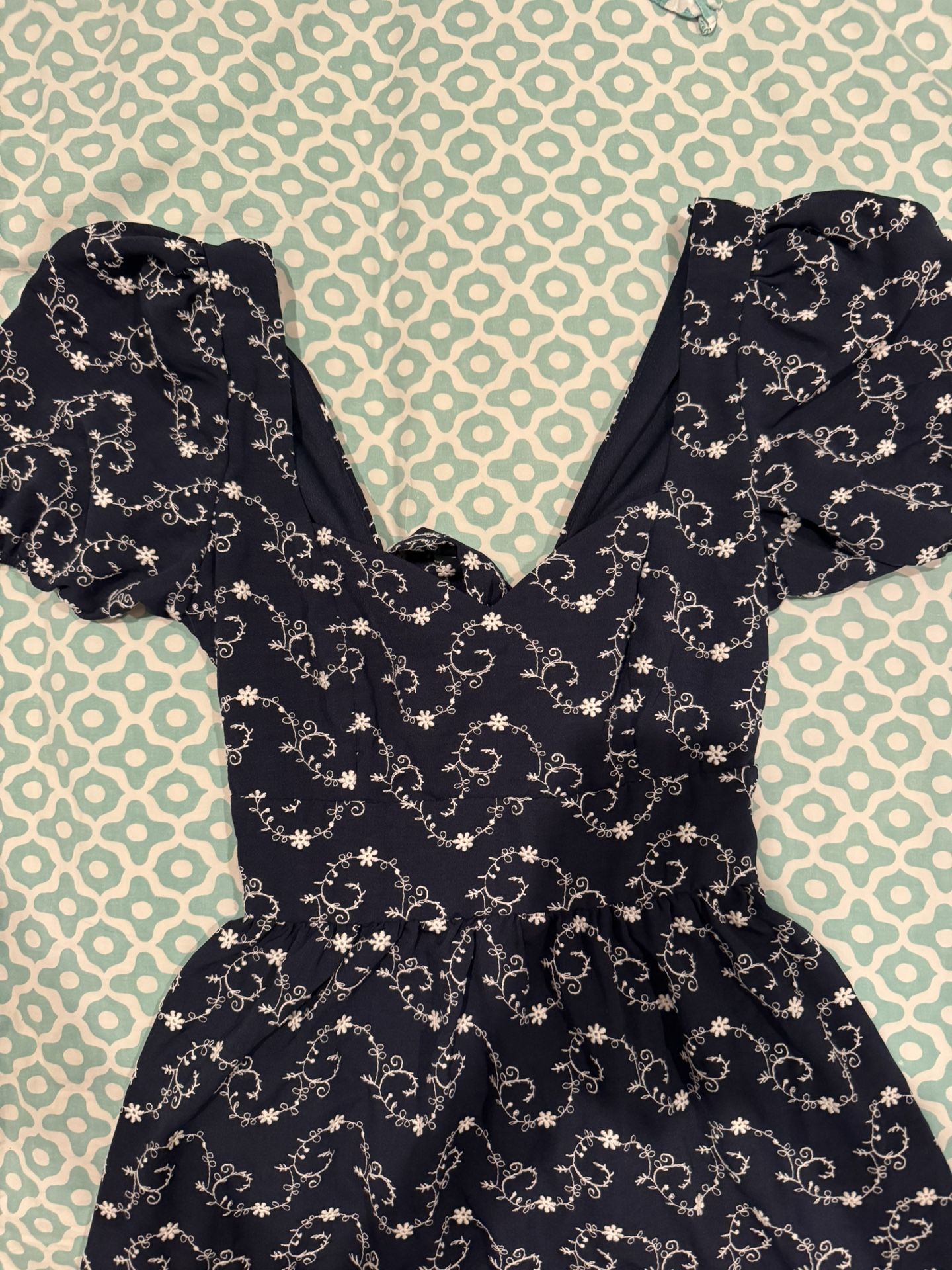 Navy blue with white flower embroidery, good quality baby doll dress with puffy sleeves and a bow in the back. It sinches in the waist and is the perfect dress for any occasion fancy or casual.