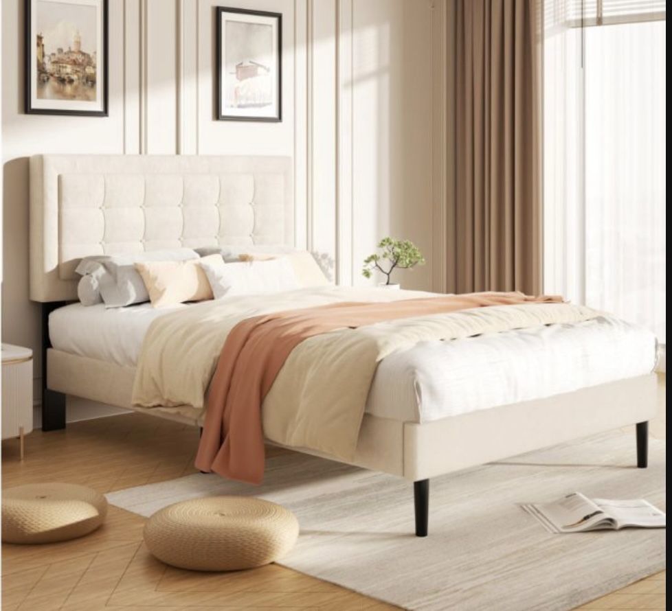 Size Full Material Wood, Linen, Metal Product Dimensions 85.03"L x 59.84"W x 41.53"H Style Modern Special Feature No Box Spring Needed, Lightweight, Fade Resistant, Squeak Resistant Color Beige Modern Design with Upholstered Headboard: This full size bed frame is designed with an elegant upholstered button tufted headboard, providing both comfort and style. The full bed frame with headboard adds a sophisticated touch to any bedroom, offering excellent back support while enhancing the overall aesthetic. Sturdy Metal Construction: Crafted from high-quality metal bed frame full, this bed frame offers exceptional durability and stability. The full size metal bed frame is built to last, ensuring your mattress is well-supported without any risk of sagging or shifting.