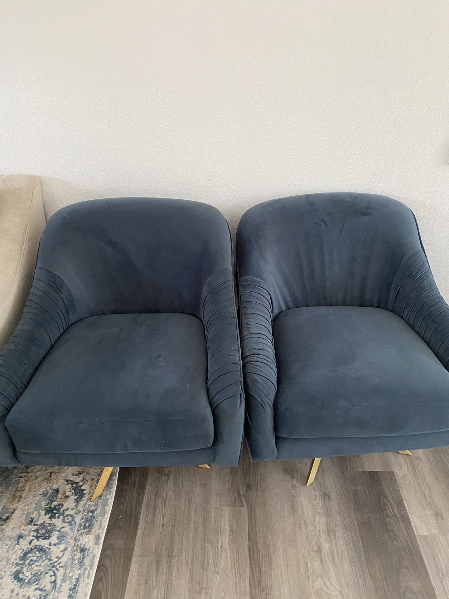 Practically brand new. Rarely sat on. They might need a little cleaning. $300 for both chairs
