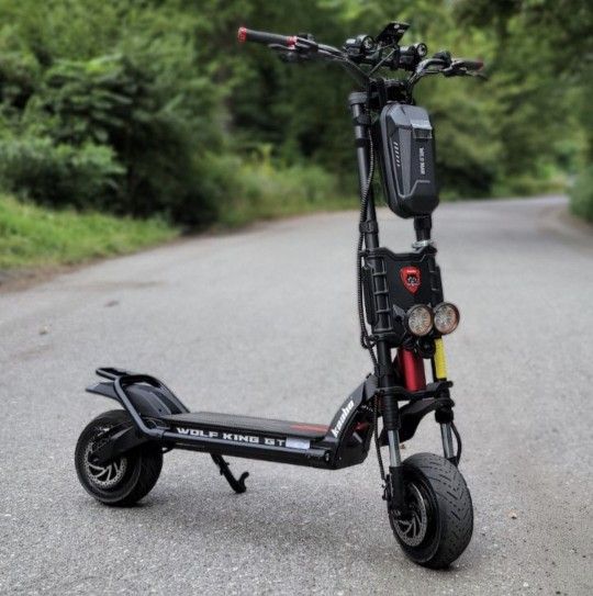 dual 2000W motors and two 50A sine wave controllers, the King GT delivers raw power and exhilarating high speeds combining the advantages of the Wolf GT with even more power. Its motorcycle grade inverted hydraulic front shock absorbers and rear spring enable a smooth ride on any terrain. Full hydraulic brakes in combination with the optionally enabled ABS system provide for safe and accurate braking power to tame this beast. In every aspect the Wolf King puts safety first: See and be seen with powerful dual front LEDs lighting up the night, front and rear turn signals enabling a ride in traffic and stylish under-deck LED lights that will ensure optimal visibility from any direction.