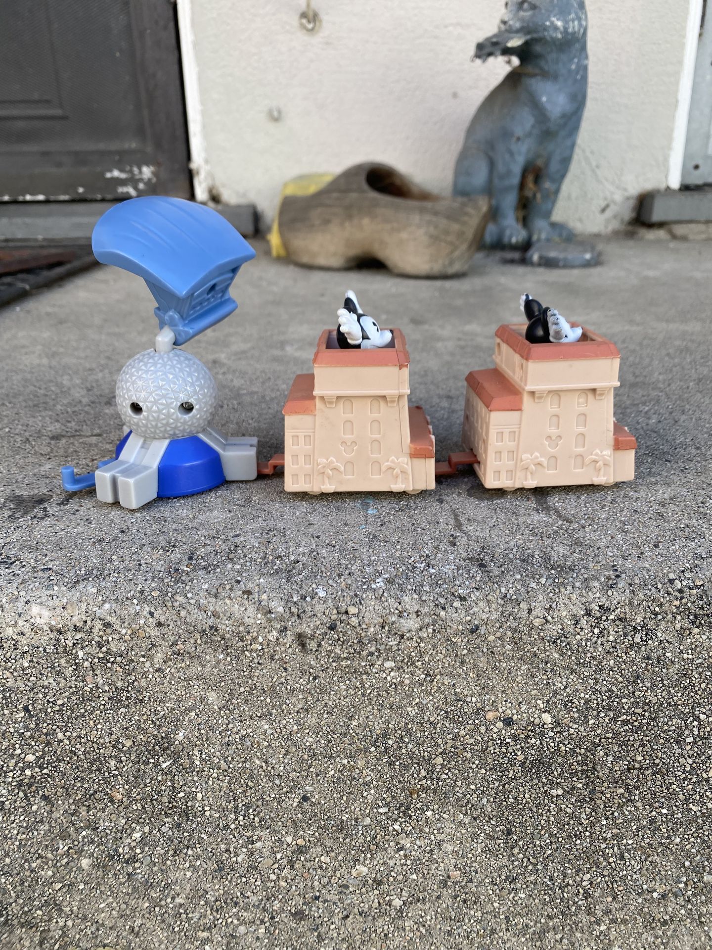 McDonald’s Disney Parks Ride Toys Lot – Tower of Terror & EPCOT Daisy Duck Happy Meal Figures (3) ⸻ Description Vintage McDonald’s Happy Meal Disney Parks attraction toy lot featuring three collectible figures inspired by classic rides. Included in this set: • Tower of Terror Hollywood Tower Hotel toy with pop-up character figure • Tower of Terror building car with second pop-up character • EPCOT Spaceship Earth ride vehicle with Daisy Duck figure These toys connect together to form a small ride train themed around Disney park attractions. The Tower of Terror buildings are marked “Hollywood Tower Hotel” and feature characters popping up from the elevator shafts. Condition appears consistent with normal play and age. Please review photos for overall detail and cosmetic condition. Fun vintage Disney park themed toys that display well together or make a great addition to a Happy Meal or Disneyana collection.