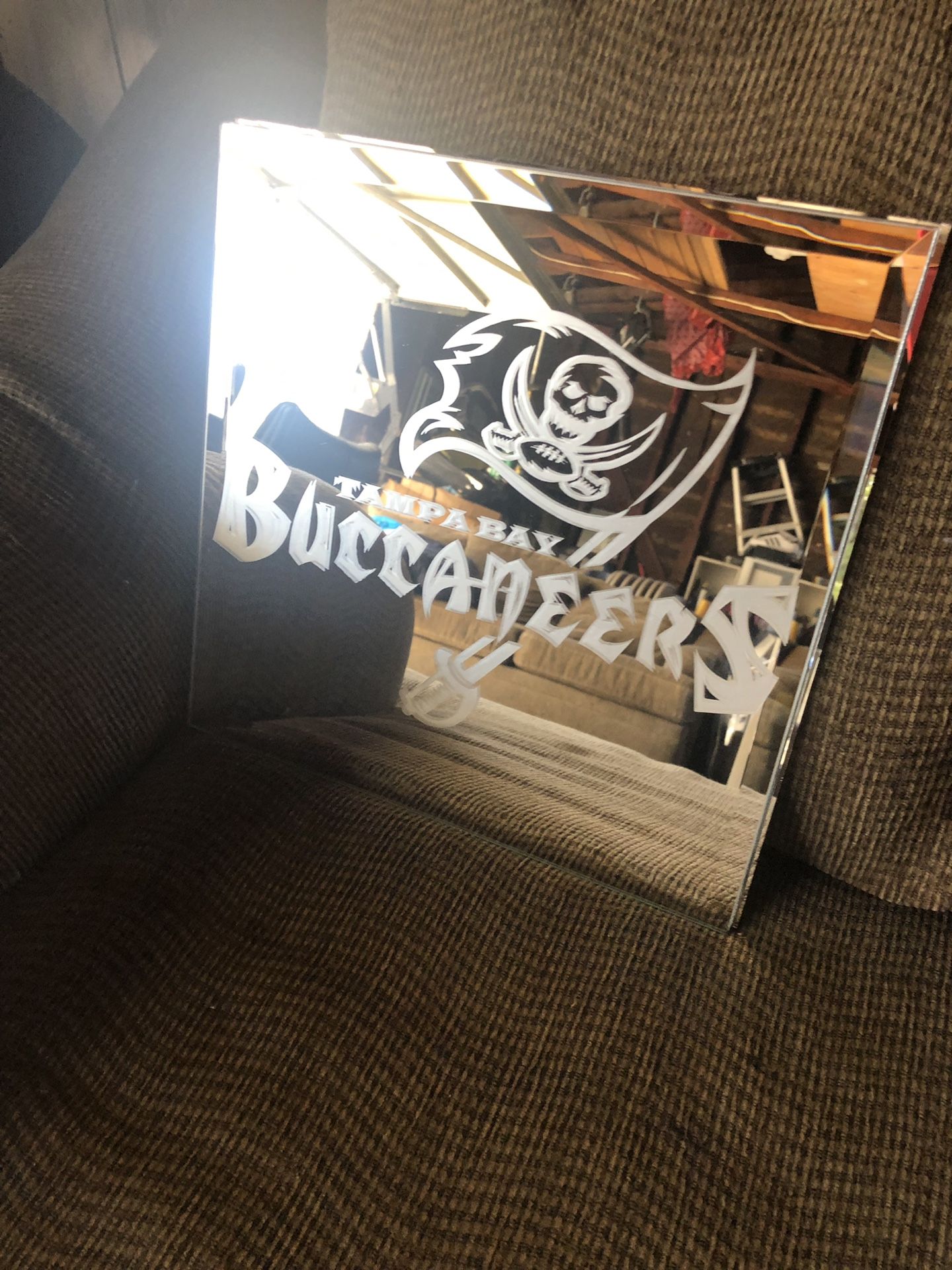 Custom Buccaneers Mirror Permanent design etched onto 12 x 12 beveled mirror. Perfect for any true fan, office, man cave or sports bar. Can add name and # 1 fan for an additional $25. Or do custom mirror at a negotiable price.