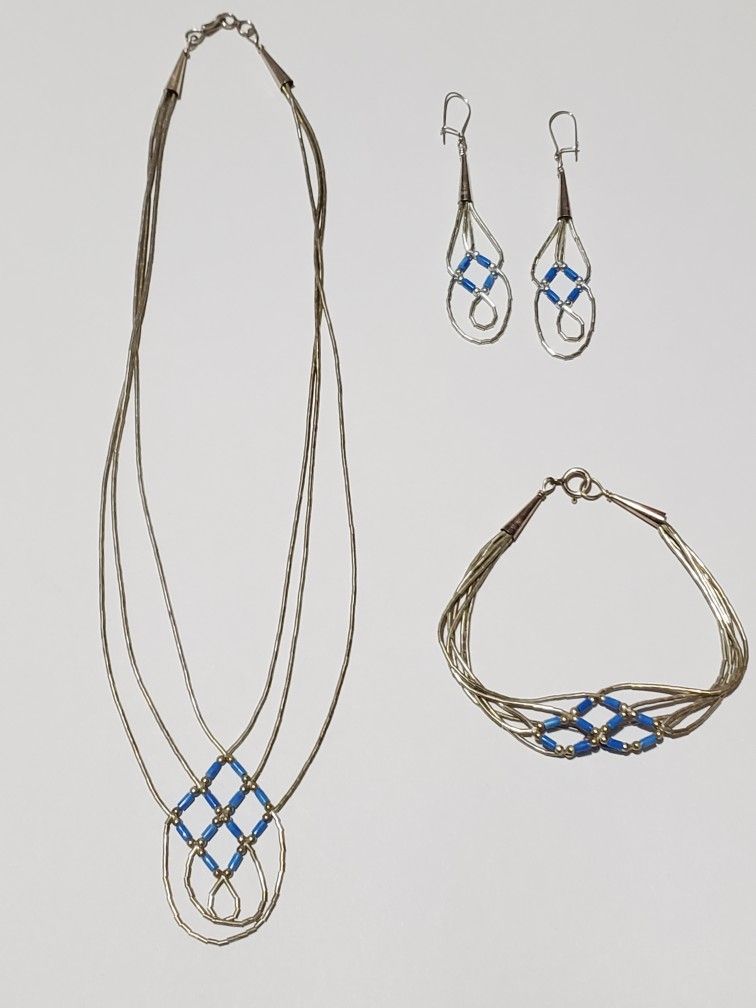 For sale is a beautiful Sterling Silver, blue Turquoise Native American jewelry set. Necklace, bracelet and earrings. Just had the set cleaned. All stamped sterling/925 Selling as a lot.