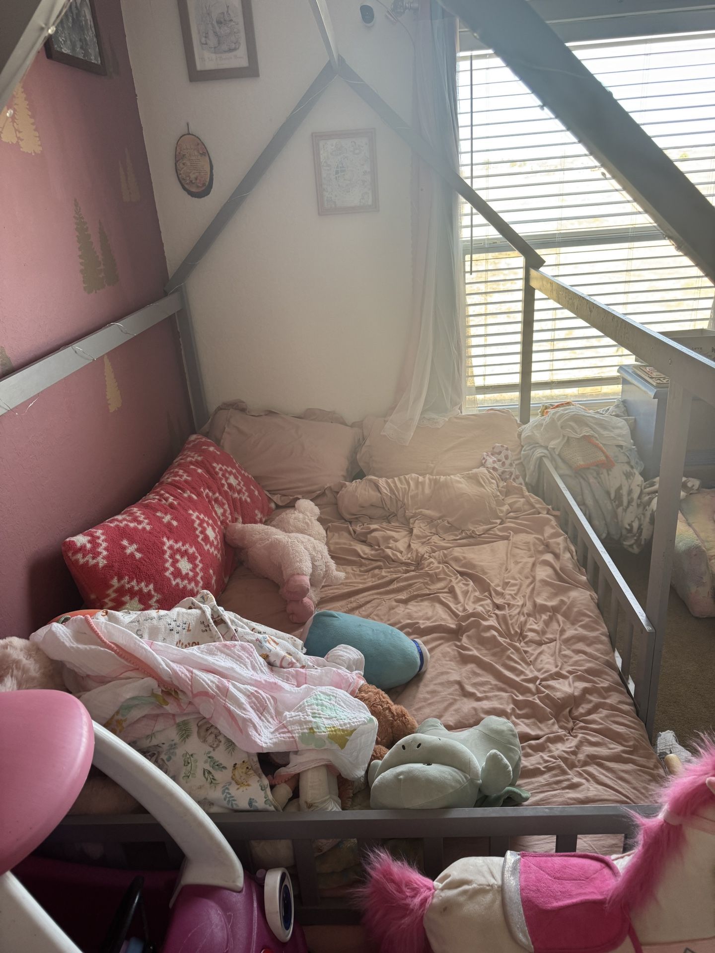 Full size house shaped floor bed. Will come with mattress and box spring if you would like (box spring is not in picture). Will be disassembled. Pick up in Moriarty or can deliver to Albuquerque if needed for an additional $10