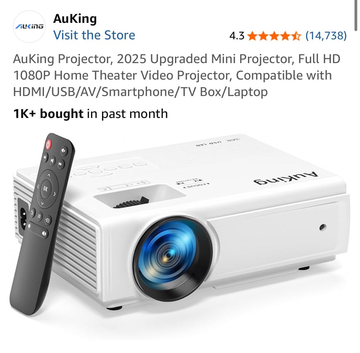 AuKing Projector, 2025 Upgraded Mini Projector, Full HD 1080P Home Theater Video Projector, Compatible with HDMI/USB/AV/Smartphone/TV Box/Laptop