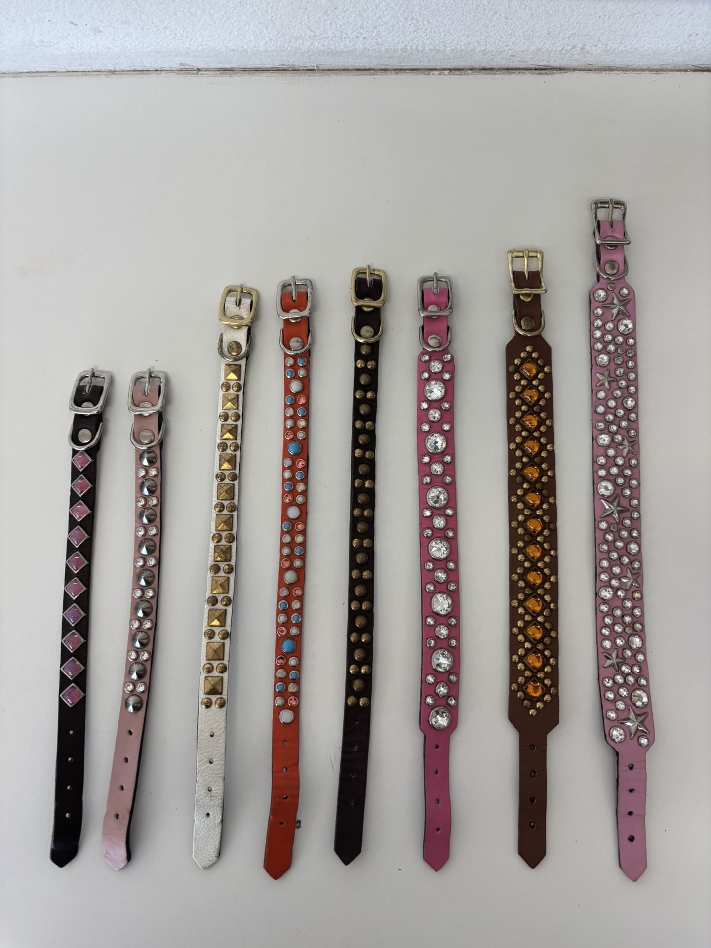 14” Pink w/ silver star shaped studs & crystal rhinestones 12.5” Brown w/ amber rhinestones & bronze studs 12” Dk Pink w/ crystal rhinestones 11 3/4” Dk Brown w/ bronze studs 12” Coral w/ turquoise, white & pink embellishments 11.5” White w/ bronze studs 9.5” Blush w/ crystal rhinestones & silver studs 9.5” Dk brown w/ pink crystal rhinestones $10 each collar Pick up only in Torrance. No delivery. Cash only. All proceeds go to senior animal rescue H.E.L.P. (Home for Every Living Pet).