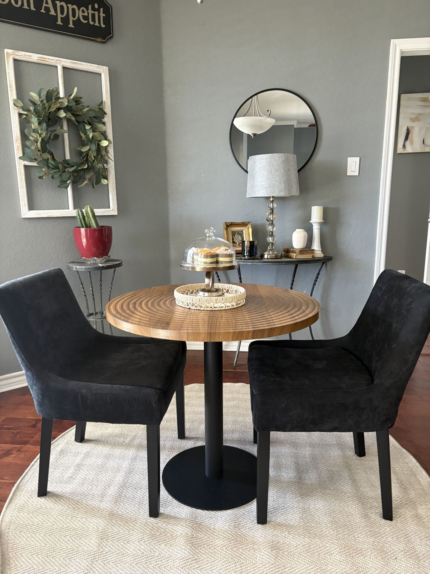 For Sale: Barely used table and two chairs. Sturdy table is wood with a black metal base (32” diam. 30” high). Chairs are black, soft upholstered corduroy, foam padding, removable cushions for cleaning. I used in my breakfast nook but would also make a great table set for a family room for playing board games and/or puzzles.