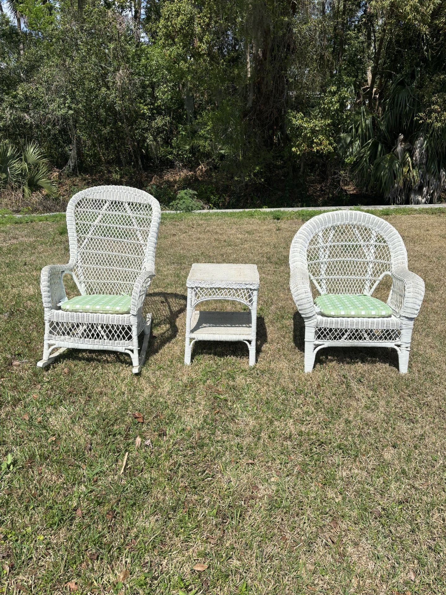 Beautiful white wicker set includes rocking chair, arm chair and accent table. Always kept in sunroom or carport, never directly outside. Great condition!
