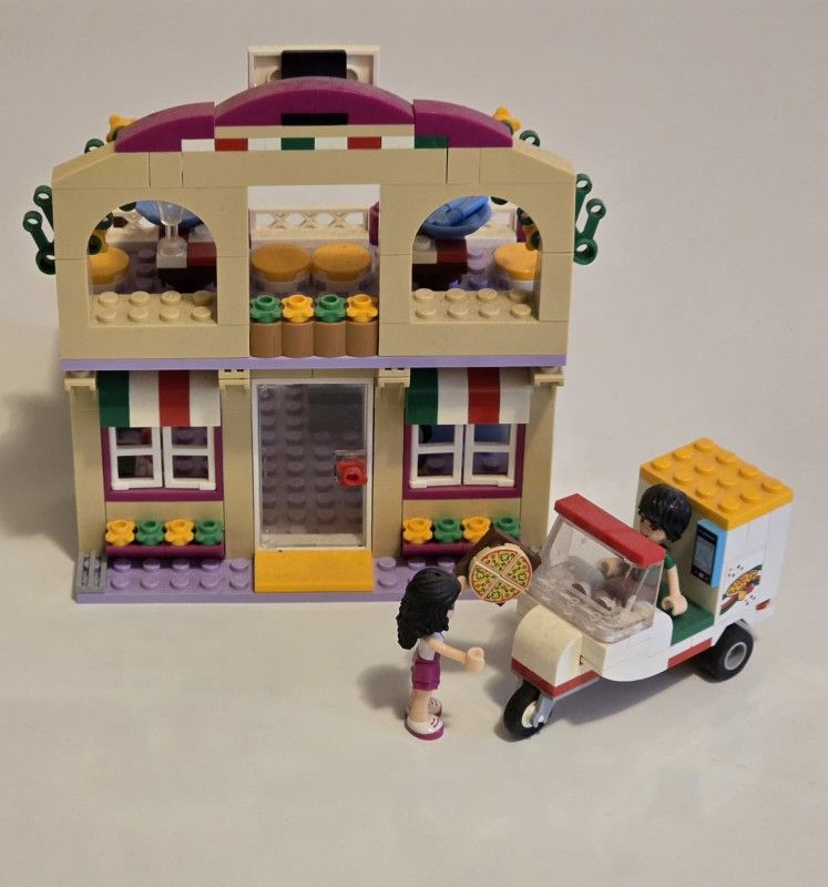 This retired LEGO Friends Heartlake Pizzeria (Set #41311) is ready for a new home! The set is already assembled, featuring the two-story restaurant, the delivery scooter, and characters Emma and Oliver. The original building instruction booklet is also included. Please note that the pieces may be a little bit dusty from being on display, but a quick rinse with mild soap and water will have them looking brand new again. This set is being sold with all pieces included—there are no missing pieces, making it a complete and delicious addition to your Heartlake City collection!