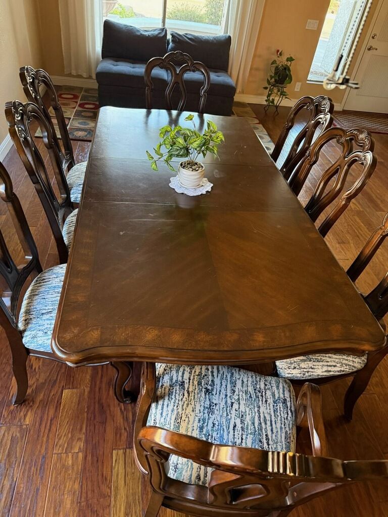 This is a solid wood table and 8 chairs including two arm chairs. Newly reupholstered cushions. The table has 2 leaves, 18 inches each making the table 92 inches long and.40 inches wide. The condition is very good with only a few minor scrathes.scratches. The matching China Cabinet is also beautiful with a nice display case and plenty of storage