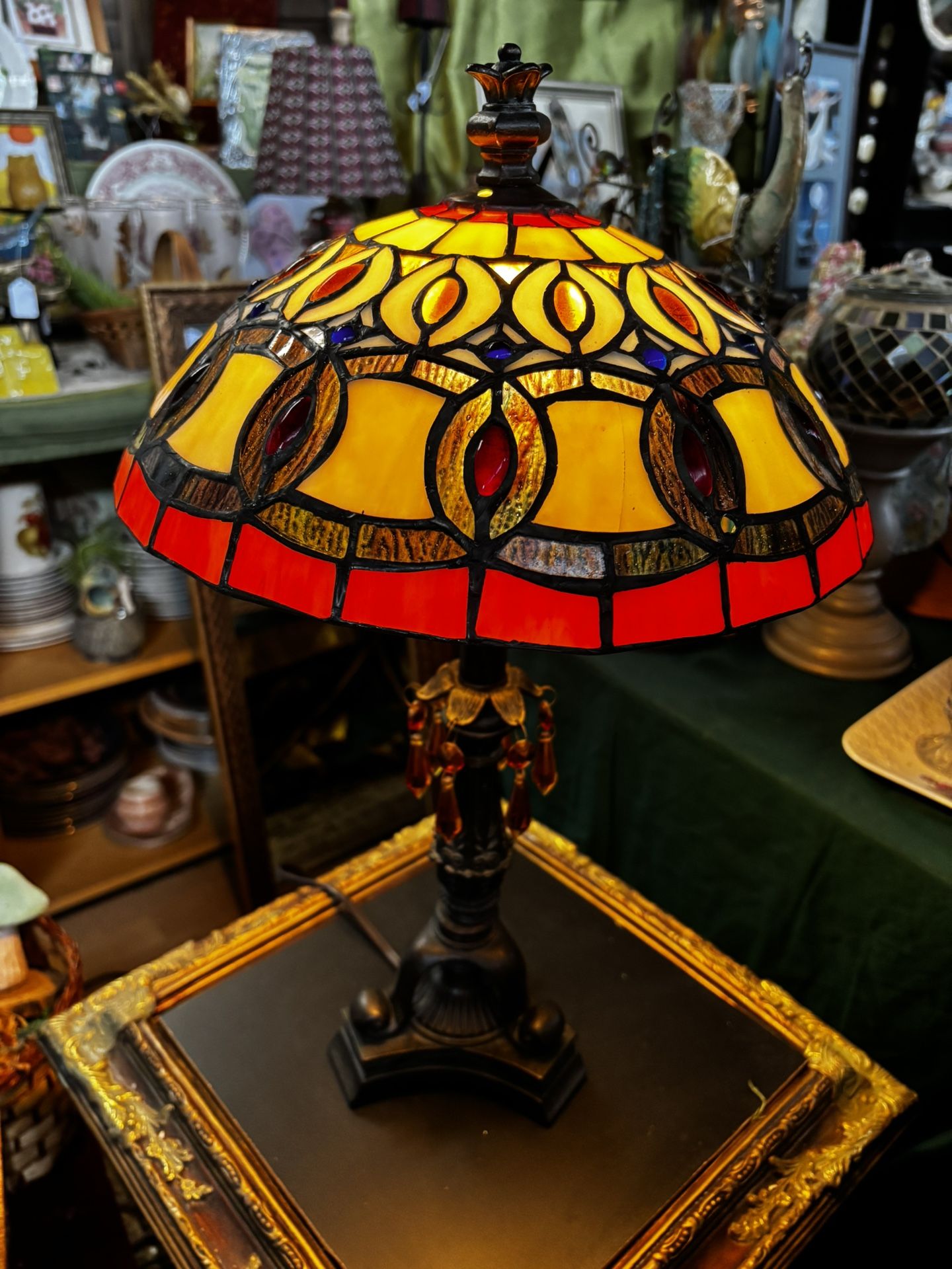 Small Tiffany style vintage stained glass table lamp metal base with topaz crystal drops