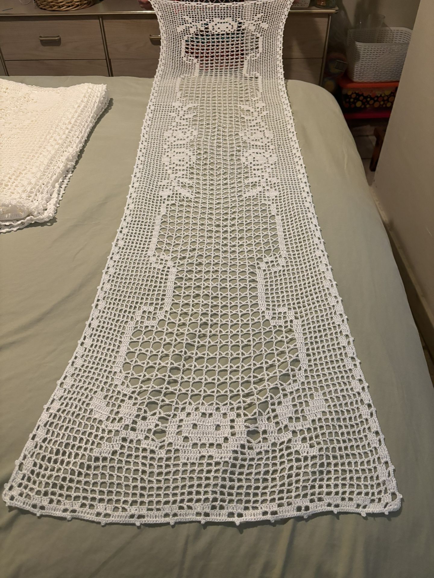 White hand made mantel Wide 52 and 1/2 by Length 98 (centimeters)