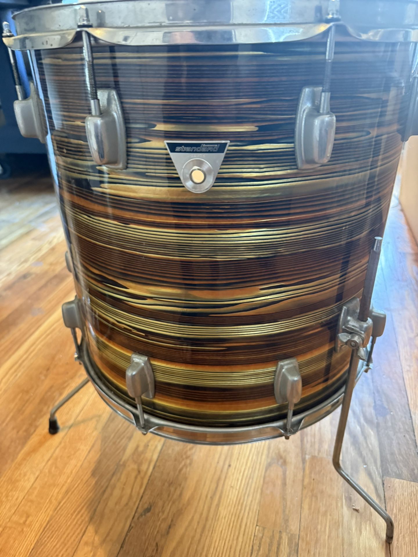 Vintage Ludwig Standard 16x16 floor tom in the harder-to-find Strata wrap (often searched as Strata or “woodgrain”). This is from the late 1960s / early 1970s Ludwig Standard era (Standards were introduced in 1968). Specs / details: Size: 16x16 Finish: Strata wrap Originality: all original shell and hardware, no extra holes Legs: 3 original legs included Interior: factory white painted interior, seen on some Ludwig Standard-era shells Muffler: the muffler arm and knob are present, the only missing piece is the small felt dampening pad (easy/cheap replacement) Condition: very good vintage condition overall, light age wear, Strata wrap presents great. Local pickup only. Asking $300. Message me if you want to check it out.