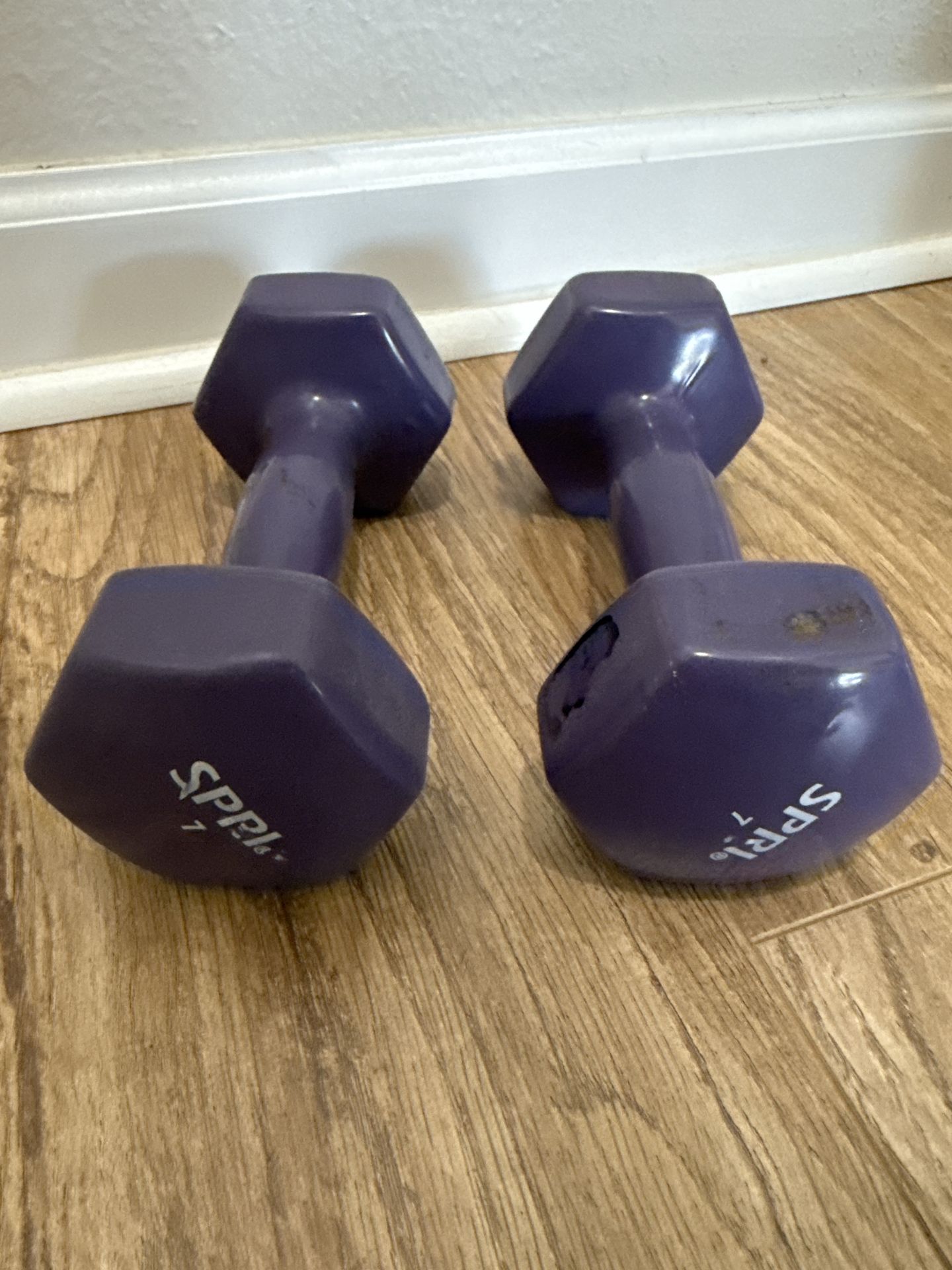 Pair of purple SPRI dumbbells, 7 pounds each.