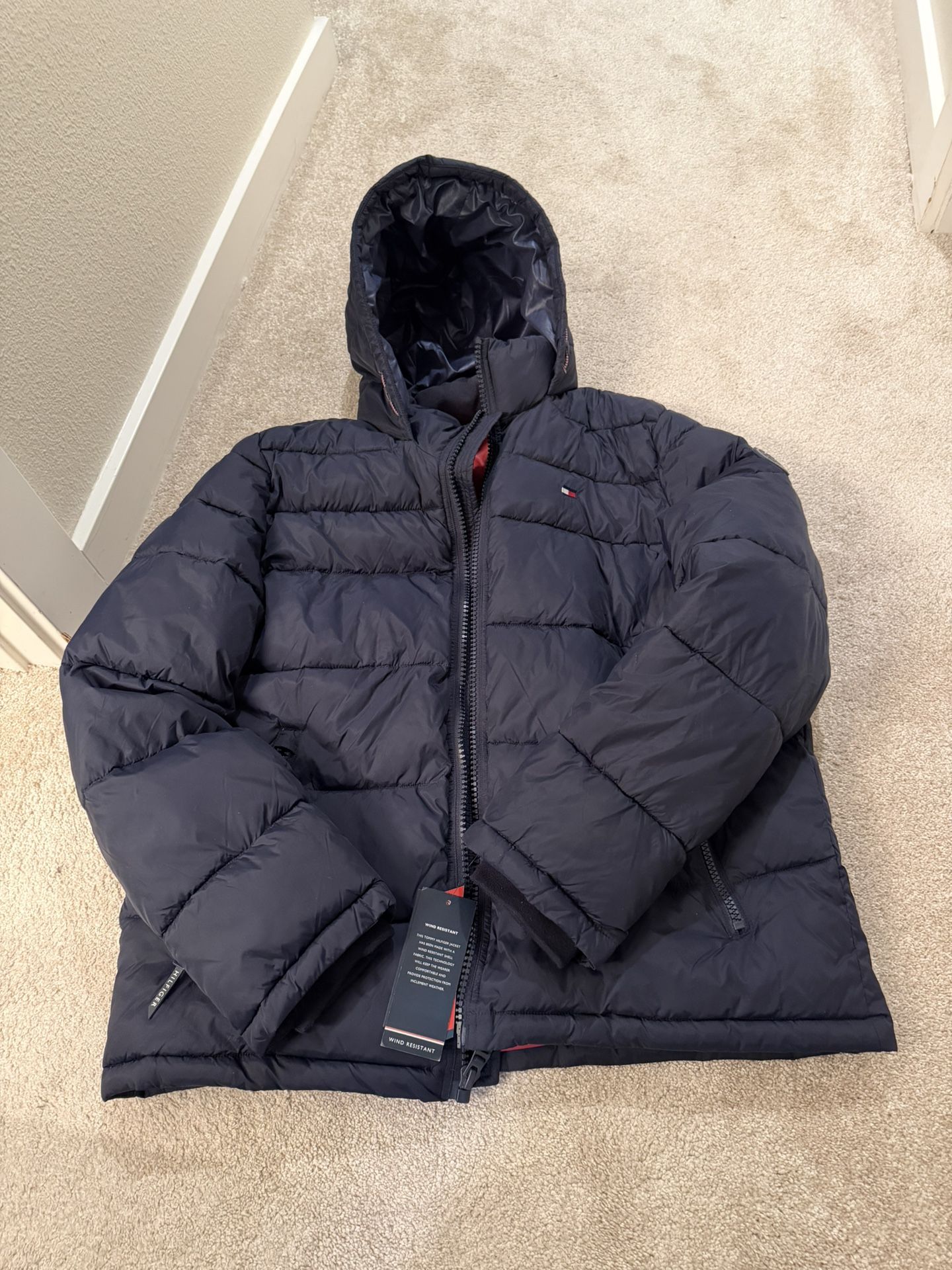 - Tommy Hilfiger hooded puffer jacket, wind resistant - Men's XL - Never been worn, still has the tags on it - I bought it a couple years ago at Macy's for $250, am asking $100 OBO - Public meetup / Cash only