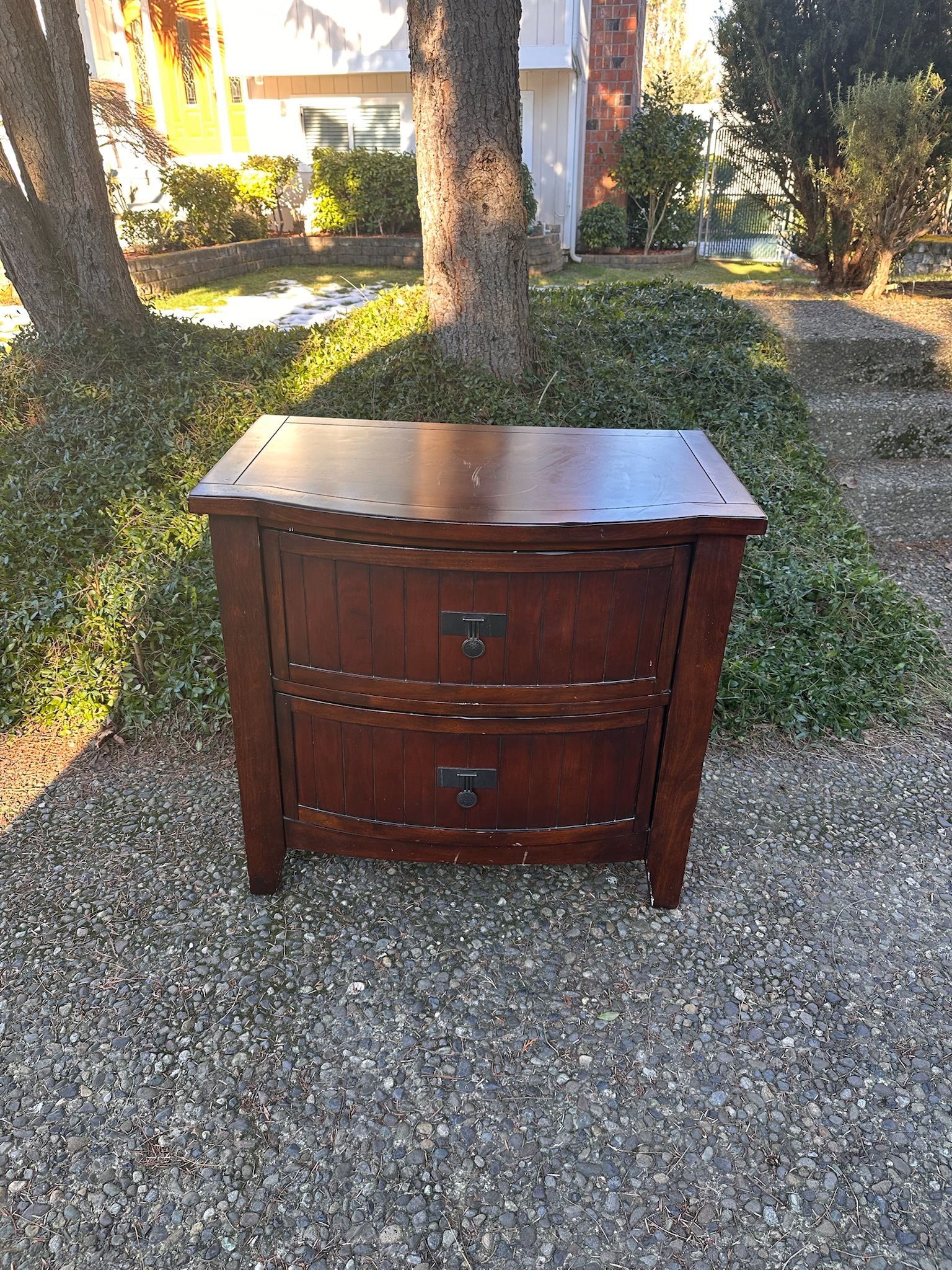 In good condition. Some scratches and wear as shown on the photos. But it is solid wood could be refinished. Drawers are wokring well. Dimensions: 30.25in H x 20in D x 32in W Solid wood nightstand small dresser