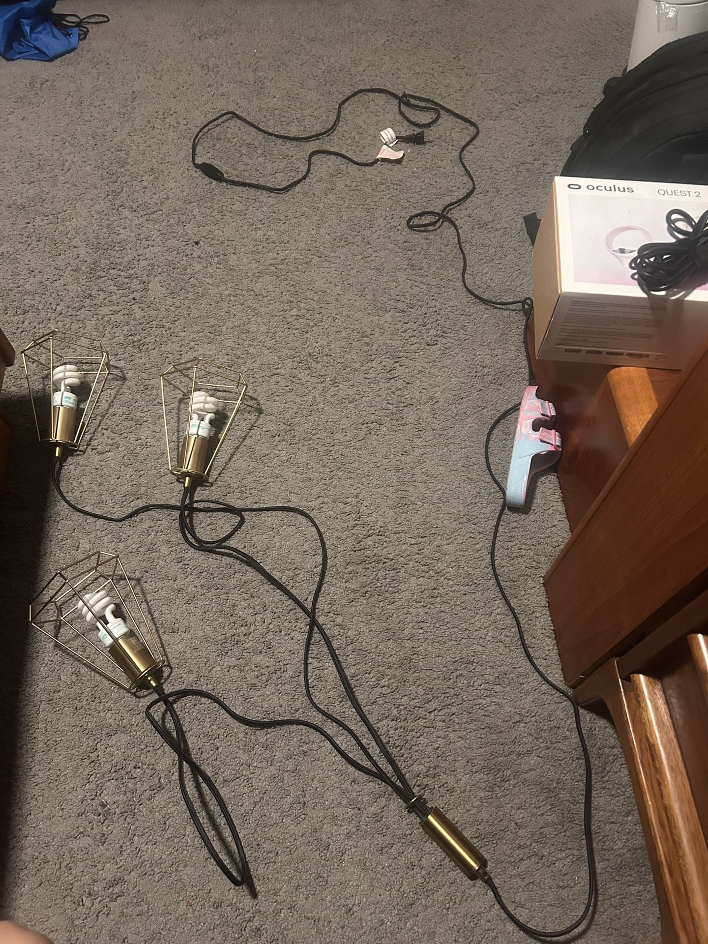 Plug in hanging ceiling lights. Has an on/off switch and works well (light color is yellow).