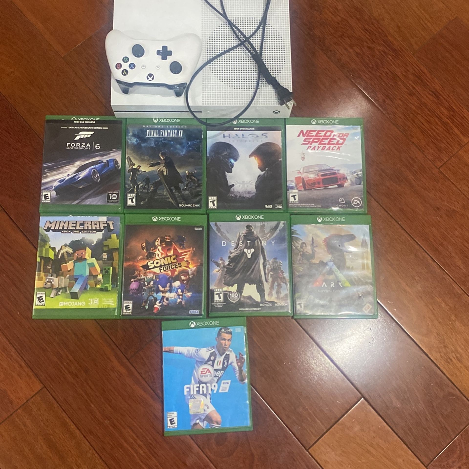 Used Xbox One S in very good condition. One controllers added with cable for the Xbox. 9 Games including Forza Motorsport 6, Final Fantasy XV Day One Edition, Halo 5 Guardians, Need For Speed Payback, Minecraft Xbox One Edition, Sonic Forces, Destiny, Ark Survival Evolved, and Fifa 19.