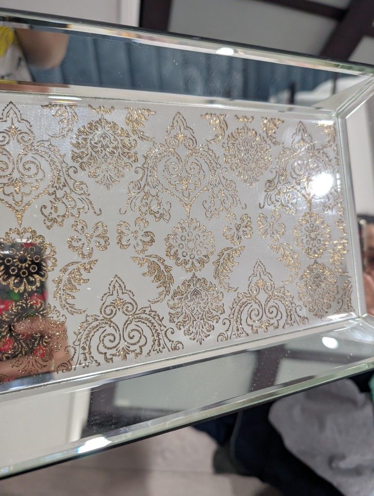 Trinket Tray, makeup tray, bathroom tray. Perfect to display perfumes, make up brushes or cotton balls in the bathroom or on a vanity desk. I believe this was a Nicole Miller pieces. Originally from home goods. Black base with mirror and gold design. Used on my vanity to display perfumes.