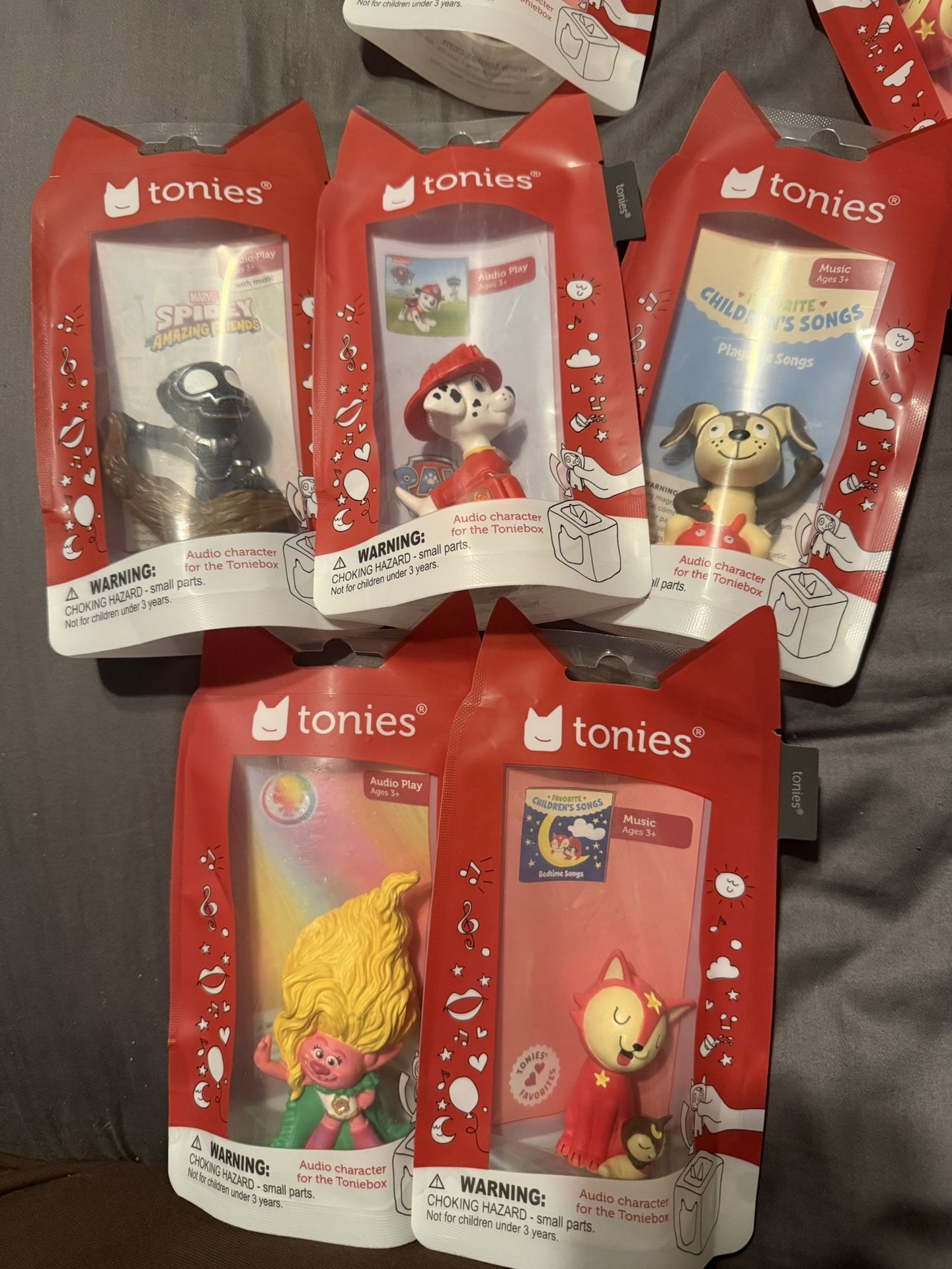 Selling a bundle of 6 brand new, sealed Tonies audio characters for the Toniebox. Perfect for kids to enjoy stories, songs, and adventures! Included characters: Spidey and His Amazing Friends Paw Patrol Marshall Favorite Children’s Songs: Playtime Songs Trolls (Poppy) Favorite Children’s Songs: Bedtime Songs Tonies Cat (Bedtime music character) $40 for ALL